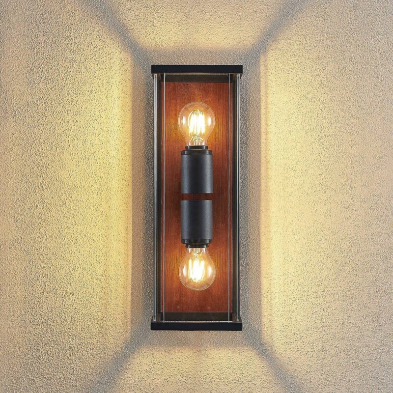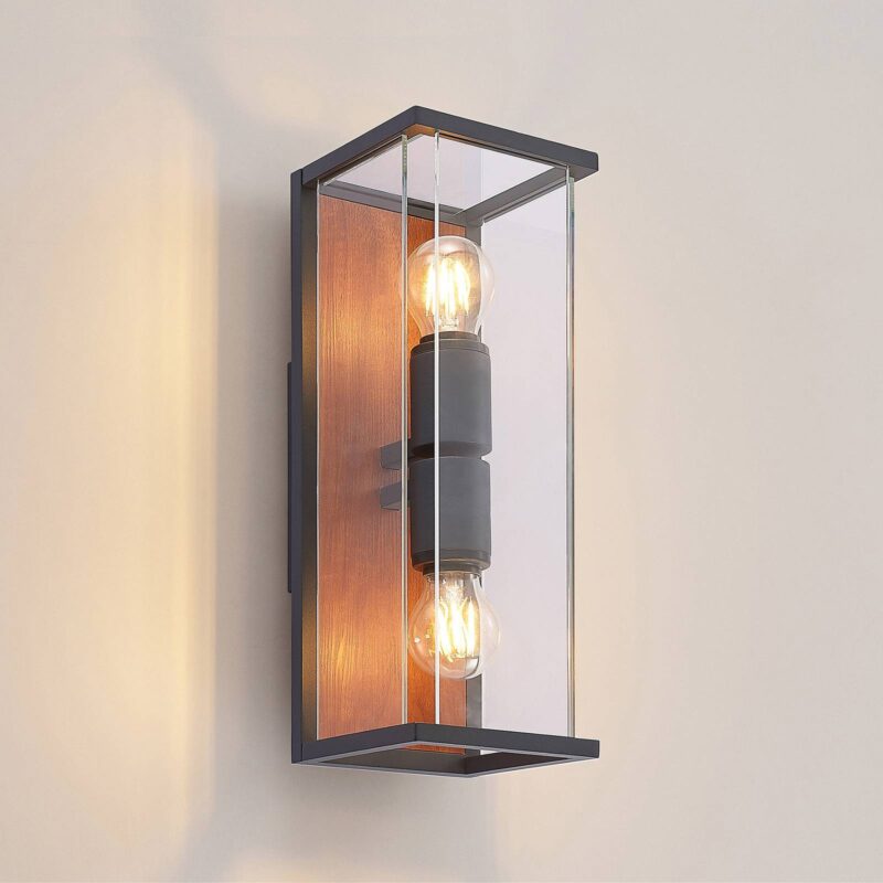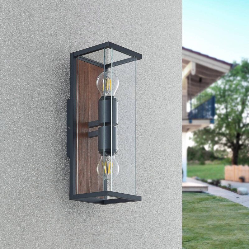 Dvojsvetelné vonkajšie nástenné svietidlo Elwin s vložkami z číreho skla a prvkom v atraktívnom drevenom vzhľade Elwin pôsobí mimoriadne lineárne, a preto sa hodí pre moderné štýly bývania a zodpovedajúce vonkajšie prostredie. Telo sa skladá z tmavosivého hliníkového rámu a niekoľkých priehľadných sklenených vložiek. Okrem toho sa v zadnej časti nachádza prvok vyrobený z určitého druhu vinylu, ktorý má dekoratívny a veľmi autenticky vyzerajúci vzhľad dreva, a tak nielen zjemňuje celkový dizajn, ale dodáva mu aj prirodzený nádych. Dve použité lampy sú dobre viditeľné, a preto by mali byť zladené s celkovým vzhľadom. Preto sa odporúčajú krásne žiarovky alebo rustikálne lampy, ktoré boli vytvorené podľa vzoru klasických žiaroviek, ale sú založené na účinnej technológii LED.