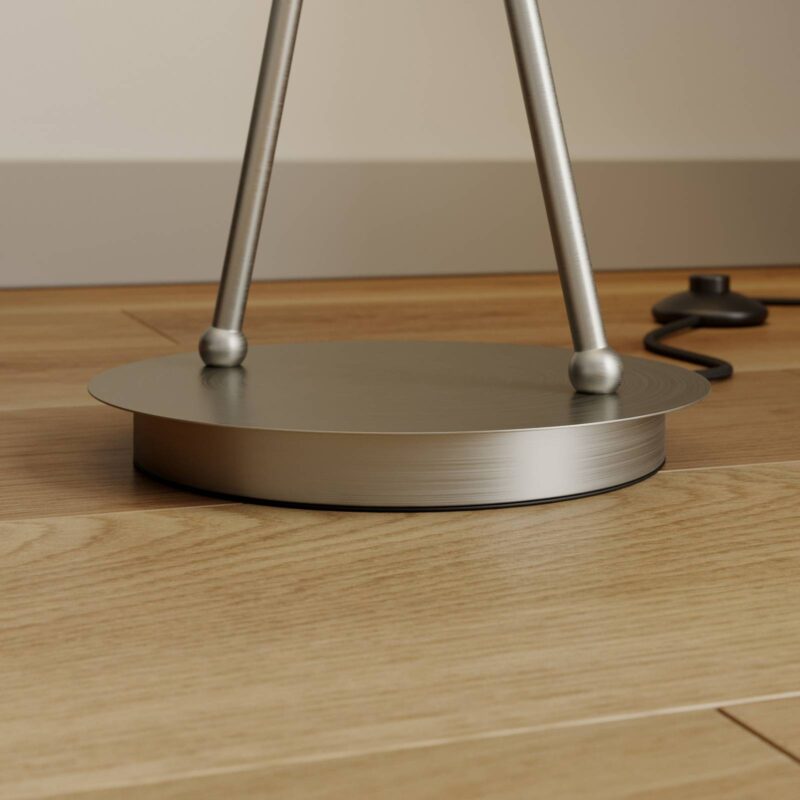 Ušľachtilé osvetlenie obývacej izby s dvojplameňovou stojacou lampou Juljana Juljana má kovový rám, ktorý sa vyznačuje obzvlášť jemnými zakrivenými líniami, takže v dizajn je mierne hravý. Dve tyče, ktoré vedú k tienidlám sa navzájom križujú a sú krásne zakrivené, zatiaľ čo ich povrch je matne satinovaný a zvyšuje celkový elegantný vzhľad. Okrúhle textilné tienidlá v atraktívnom odtieni, ktorý pôsobí zemito a kombinuje svetlošedé, krémové a hnedé tóny. Dizajn svietidla pôsobí príjemne a domácky, tento dojem sa samozrejme posilní pri zapnutí svetelných zdrojov, pretože potom je obývacia izba zaplavená zvláštnou útulnosťou a stojacu lampu je možné použiť ako večerné atmosférické osvetlenie. Vzhľad určuje aj určitá nadčasovosť, takže lampu je možné použiť v rôznych štýloch zariaďovania a umiestniť ju do mnohých obývacích izieb. Integrovaný nožný spínač v napájacom kábli uľahčuje obsluhu stojacej lampy Juljana.