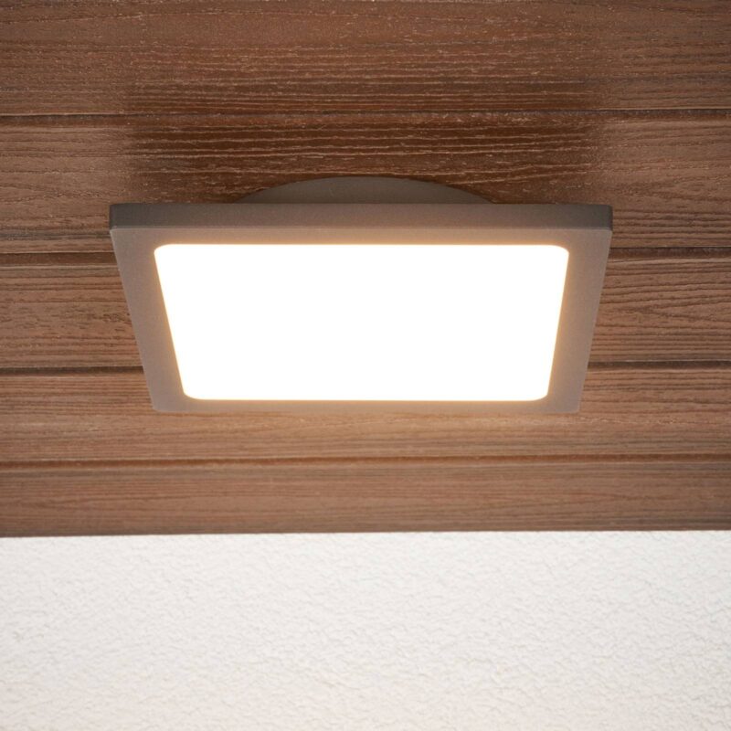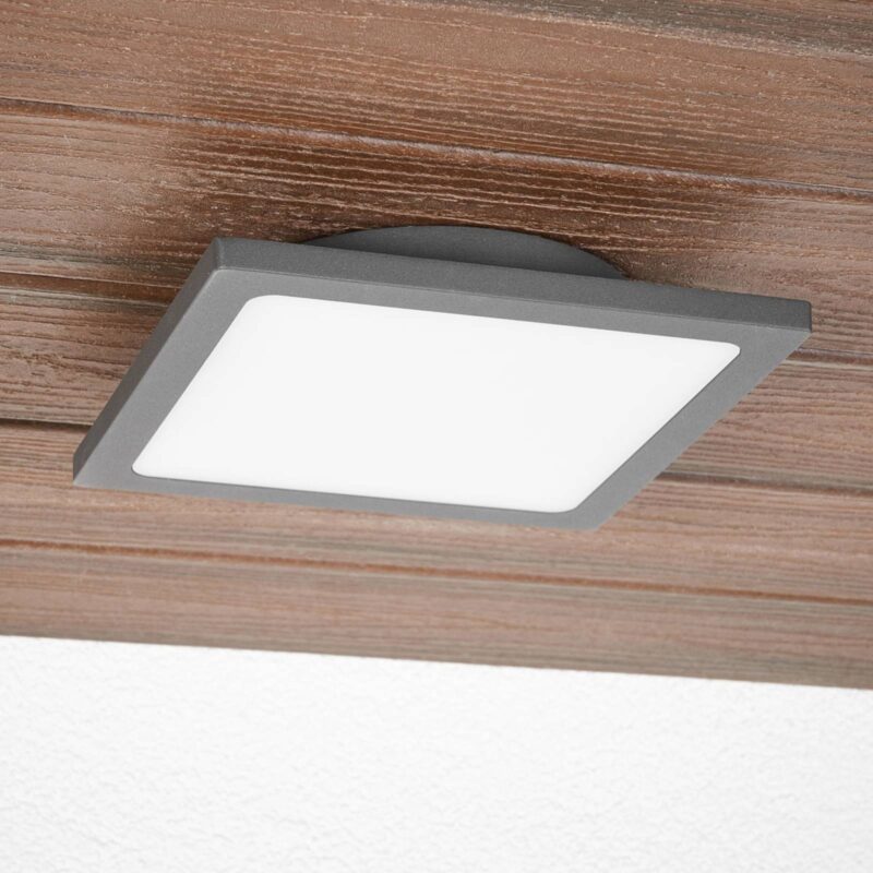 Senzorom riadené vonkajšie stropné svietidlo LED Mabella v základnom štvorcovom tvare, IP65 Antracitová farba je jednou z trendových farieb pre vonkajšie svietidlá, ktoré možno ľahko kombinovať s moderným celkovým vzhľadom. Rám vonkajšieho stropného svietidla Mabella LED je tiež vo farbe antracit a je doplnený plastovým krytom z bieleho polykarbonátu. Vďaka tomu je svetlo vyžarované stropným svietidlom LED relatívne rovnomerné. Integrovaný je aj snímač, ktorý zabezpečuje, aby sa vonkajšie stropné svietidlo s LED zaplo v prípade potreby, t. j. pri zaznamenaní pohybu v maximálnom dosahu 6 metrov. Doba svietenia je variabilná a v závislosti od nastavenia je 10 sekúnd, 90 sekúnd, 3 minúty alebo 10 minút. Ak je svietidlo Mabella namontované na strope, detekčný uhol je 360°; ak sa používa ako svietidlo na stene, uhol je 150°.