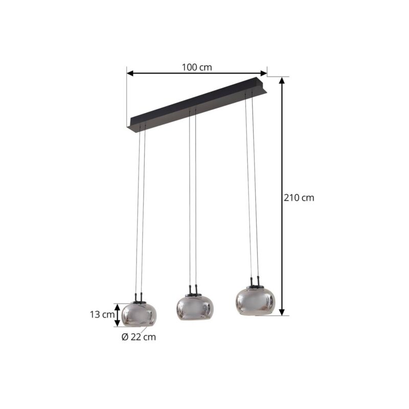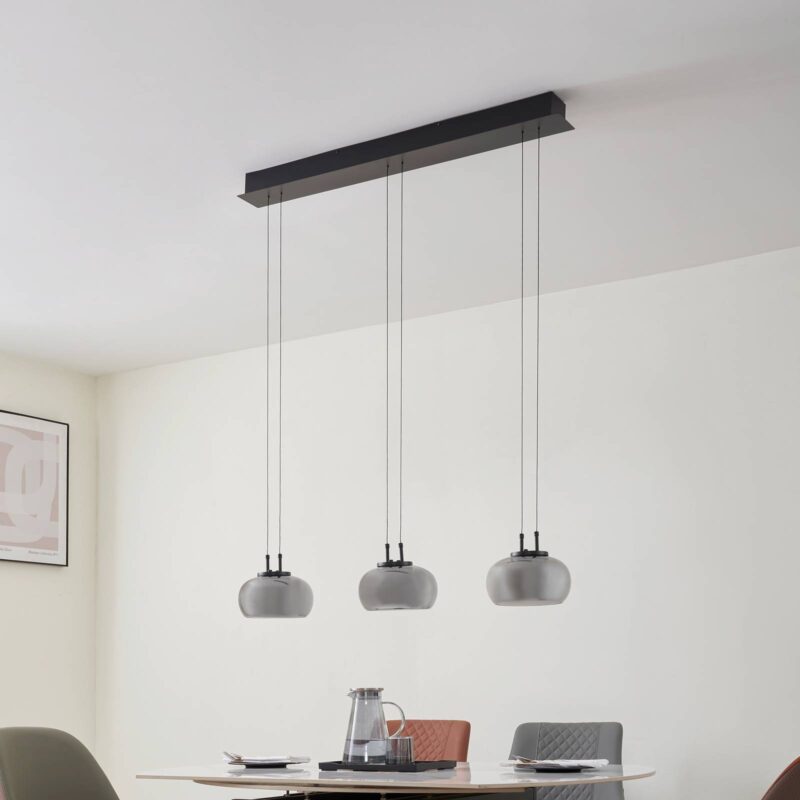 Trojsvetelné závesné svietidlo Dain LED v dymovo sivej farbe so skleneným tienidlom Trojsvetelné závesné svietidlo Dain LED s dymovo sivým sklom poskytuje atmosférické osvetlenie v každej miestnosti. Integrovaný svetelný zdroj LED zaručuje nielen energeticky úsporné osvetlenie, ale aj dlhú životnosť. Toto svietidlo je obzvlášť účinné v jedálňach a obývacích izbách, kde vytvára atmosféru, ktorá pozýva k odpočinku a spoločenskému posedeniu – závesné svietidlá sú výškovo nastaviteľné v rozmedzí 28 – 210 cm