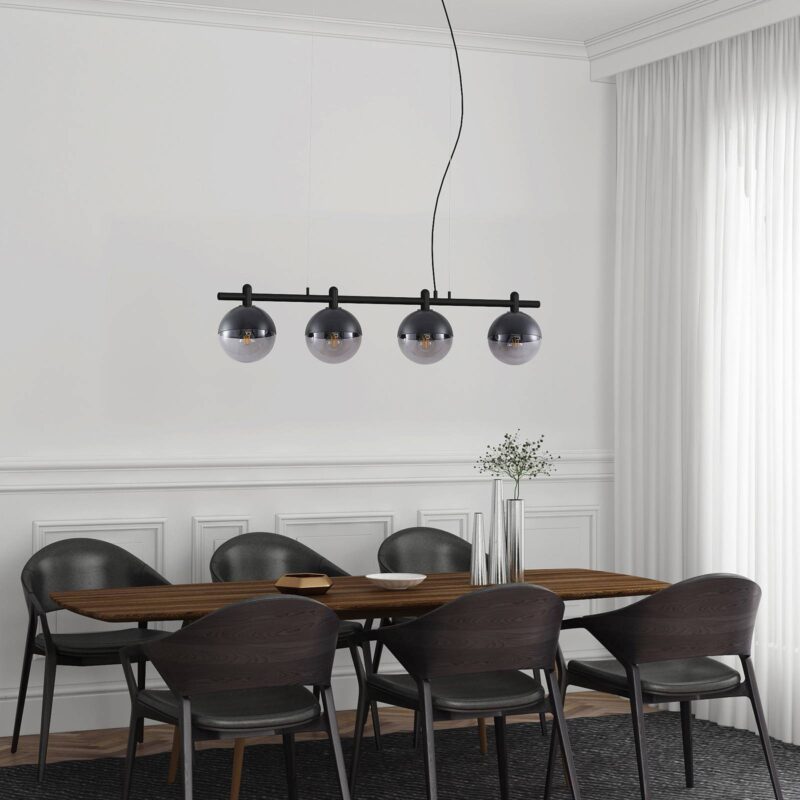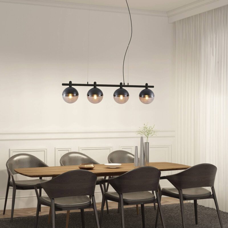 Pre základné osvetlenie jedálenského priestoru – závesné svietidlo Dustian so štyrmi svetelnými zdrojmi a výnimočným dizajnom Dustian presviedča na celej línii hlavne guľovými tienidlami na pozdĺžnom a rovnom hranole a svetlom smerujúcim nadol. Polovica tienidla je vyrobená z čierneho lakovaného kovu, zatiaľ čo druhá polovica je na spodnej strane vyrobená z krásneho číreho skla. Kontrast predstavuje určitý dvojzložkový vzhľad, ktorý stelesňuje modernosť a unikátny dizajn. Čierna povrchu kovu je trendy a je hlavnou výhodou svietidla z tejto série. Toto moderný chlad, ktorý vychádza zo svetelného zdroja s výrazným charakterom, je vynikajúco vyvážený, ak používate žiarovky s veľmi teplou farbou bieleho svetla, ktorá sa takmer zmení na jantárovú. Vo verzii so štyrmi žiarovkami je závesná lampa ideálna na osvetlenie v jedálňach alebo ako osvetlenie na pultoch a všeobecne presvedčí sebavedomým a trochu hravým vzhľadom, ktorý v moderných obytných priestoroch vyzerá veľmi krásne a stelesňuje vynikajúci dizajnový jazyk. Pri výbere osvetľovacích prostriedkov je možné zvoliť mnoho možností – o niektorých z nich sa dočítate neskôr. Pretože sklenený kryt sa dá rýchlo a ľahko priskrutkovať a odskrutkovať, výmena žiarovky je celkom jednoduchá. Otvor je taký veľký, že sa môžu použiť aj žiarovky s priemerom do 9,5 cm, ktoré vyzerajú vďaka ich veľkosti za čírym sklom impozantne. Iným variantom je použitie žiaroviek so zrkadlovou hlavou, ktoré znižujú oslnenie na minimum a poskytujú príjemné nepriame svetlo. Ak máte k dispozícii externý stmievač, môžete samozrejme použiť aj žiarovky s možnosťou tlmenia, pri ktorých si môžete nastaviť intenzitu jasu podľa individuálnej nálady.