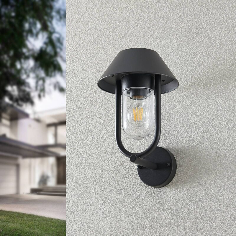 Vonkajšie nástenné svietidlo Olinum s tmavosivou povrchovou úpravou Tmavosivé vonkajšie nástenné svetlo Olinum má robustné puzdro a zaujme tiež moderným vzhľadom. Táto lampa je vyrobená z hliníka a nehrdzavejúcej ocele a má tmavý dizajn, ktorý v modernom prostredí vyzerá veľmi pekne. Priehľadné tienidlo zo skla vám poskytne jasný výhľad na bod horenia. Preto je ideálny dekoratívny zdroj svetla, napríklad energeticky úsporná LED žiarovka s moderným vzhľadom vlákien. Vďaka triede ochrany IP44 je Olinum optimálne chránené pred dažďom a vlhkosťou, takže je svietidlo vhodné na dlhodobé vonkajšie použitie.
