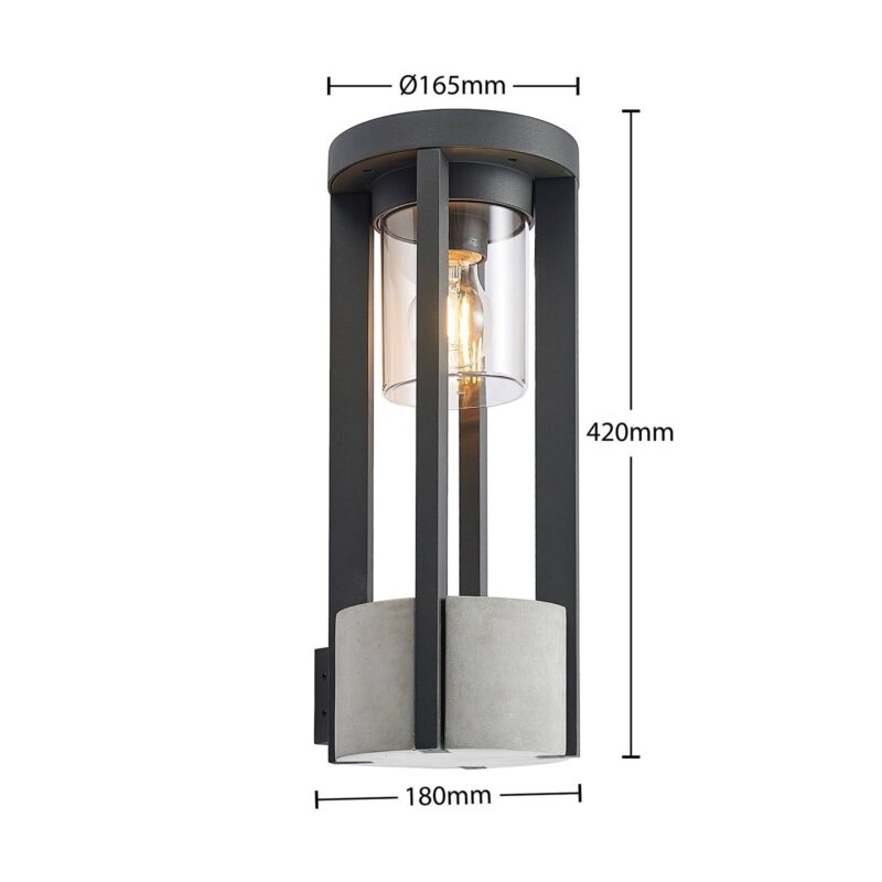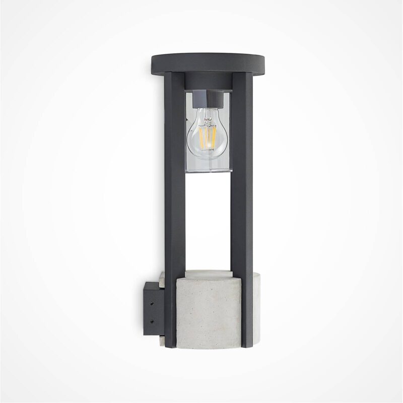 Vonkajšie nástenné svietidlo Overa – špeciálny dizajn pre moderné vstupné priestory Ideálne osvetlenie do vstupného priestoru alebo na terasu – to je moderné vonkajšie nástenné svietidlo Overa. Je prezentovaná v štýlovej a výraznej tmavošedej farbe, ktorá je okamžite nápadná. Kryt je valcovitého tvaru a je navrhnutý tak, aby bol otvorený. Vo vnútri sa nachádza priehľadný kryt obrazovky, ktorý chráni horák E27. V Basis je nainštalovaný cementový základ , ktorý dotvára zvláštny vzhľad tejto žiarovky.