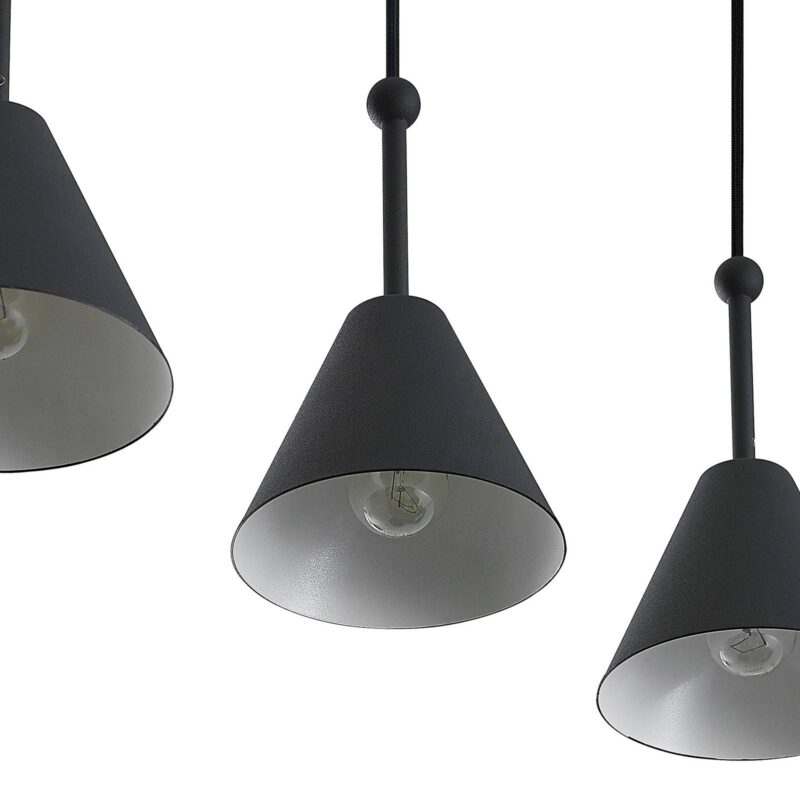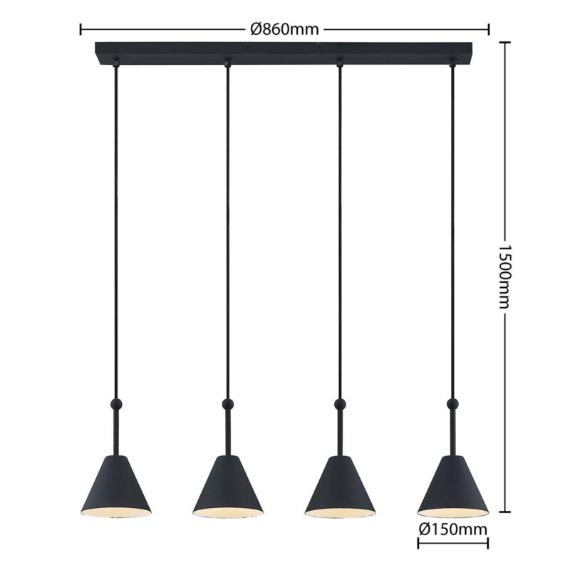 Štvorsvetelné závesné svietidlo Phina z ocele v čiernej farbe s bielymi akcentmi Závesné svietidlo Phina je ideálne na osvetlenie obývačky alebo jedálne. Skladá sa zo železa a je v čiernej farbe, zatiaľ čo vnútorná strana jeho tienidiel je biela. Jeho podlhovastý tvar pozostáva z podlhovastého stropného svietidla, ku ktorému sú pripevnené štyri závesy, z ktorých visí tienidlo. Ak sú vybavené žiarovkami E27, ich steny vytvárajú neoslňujúce osvetlenie a harmonickú atmosféru. Závesné svietidlo Phina sa vďaka svojmu módnemu dizajnu ľahko začlení do širokej škály interiérových štýlov a vytvorí elegantné akcenty v interiéri.