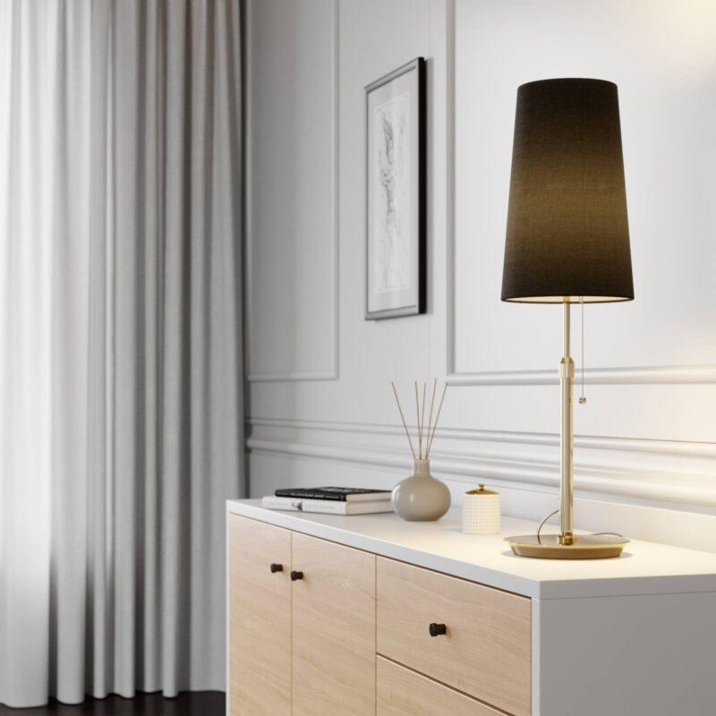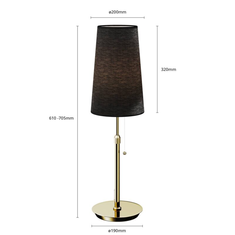 Úzka látková stolná lampa Pordis s čiernym textilným tienidlom a kovovým rámom z mosadze, výškovo nastaviteľná Lampa Pordis sa s mosadzným rámom veľmi dobre hodí ku klasicky pôsobiacemu zariadeniu. Čierne látkové tienidlo štýlovým a vhodným spôsobom dopĺňa celkový dizajn stolnej lampy a poskytuje tlmené svetlo s príjemným efektom, takže lampu Pordis môžete použiť ako zvýrazňujúce osvetlenie v obývacej izbe, keď chcete zvýrazniť útulnosť a už nutne nepotrebujete jasné svetlo. Pomocou teleskopickej tyče sa môže upraviť výška rámu od 61 cm do 70,5 cm, a tým sa môže prispôsobiť miestnym podmienkam. S týmto skutočne vysokým rozmerom je stolná lampa Pordis predurčená byť lampou na stôl. Lampa sa zapína pomocou šnúrového vypínača, ktorý vyzerá elegantne, a dopĺňa celkový dizajn.
