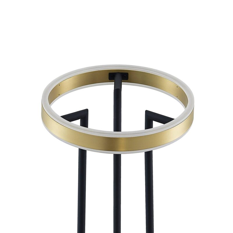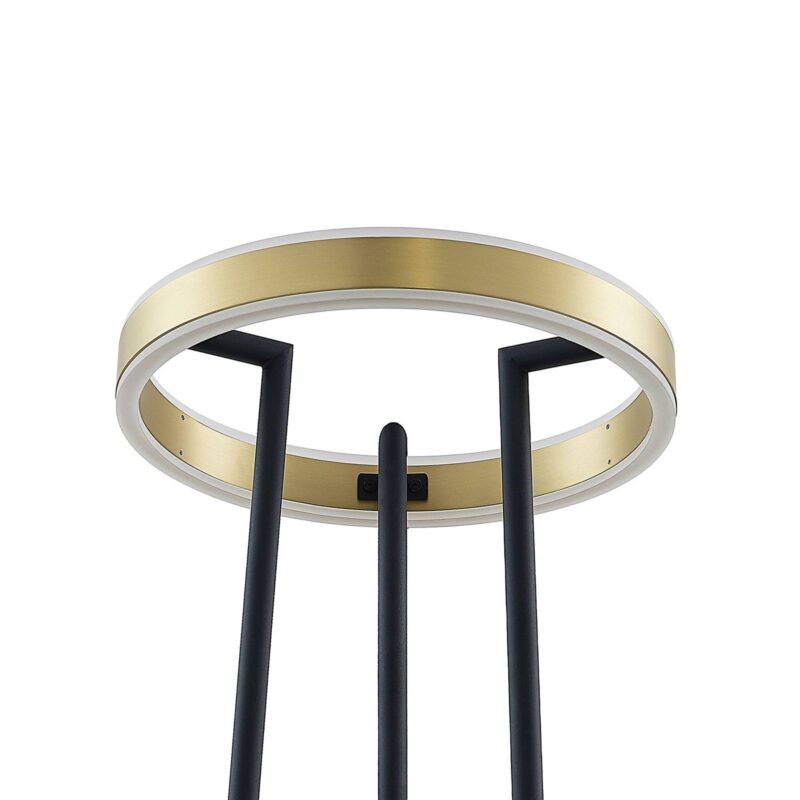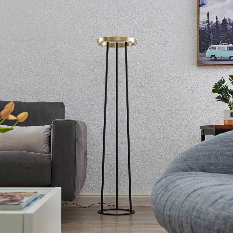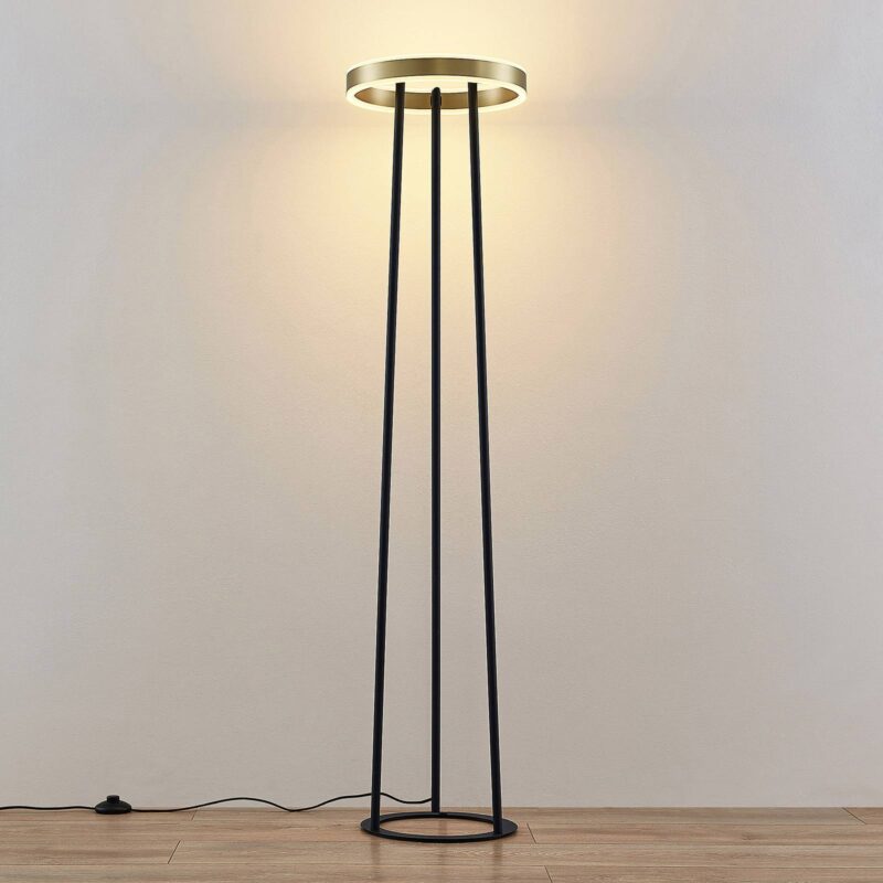 Tenké stojace LED stojaca lampa Seppe v modernom dizajne v mosadznej a čiernej farbe Seppe je moderné a praktické LED stojaca lampa, ktoré si nájde svoje ideálne miesto najmä v obývacej izbe. Stojí na štíhlej nohe, ktorá sa skladá z troch vzpier a na konci má tienidlo na lampu v tvare kruhu. Okrem toho môže byť svetlo tlmené z hľadiska jeho jasu. Pomocou dotykového spínača je možné svetlo zapínať a vypínať obvyklým spôsobom. Vďaka trojstupňovej technológii stmievania s integrovanou funkciou vypnutia ju možno stlmiť aj na tri rôzne úrovne jasu niekoľkonásobným stlačením spínača: 100%, 50% a 10%. Preto stojaca lampa Seppe LED vytvára vždy správne svetlo a vytvára harmonickú atmosféru.