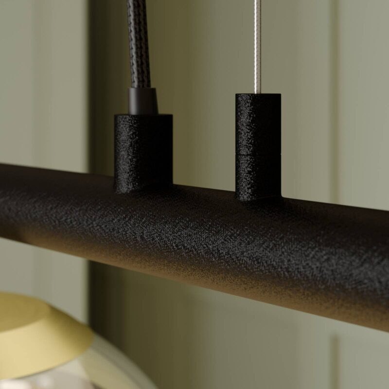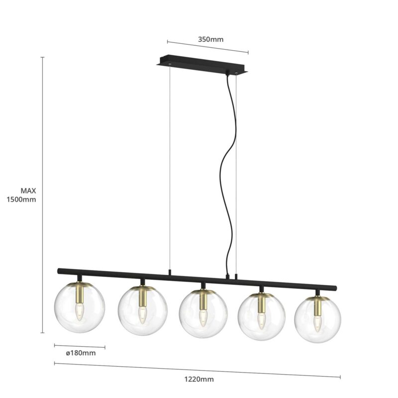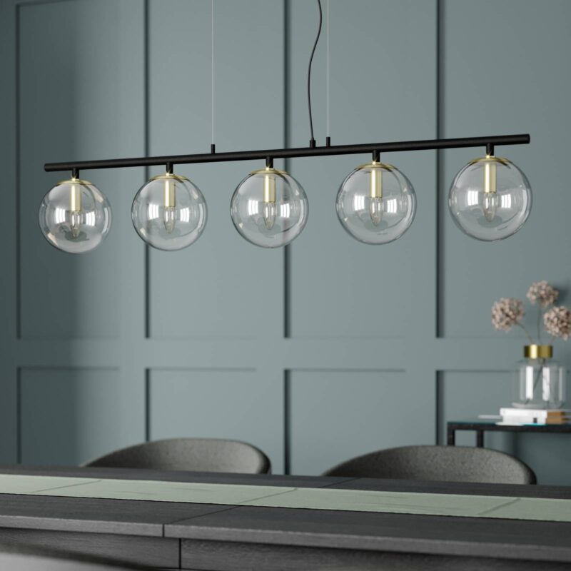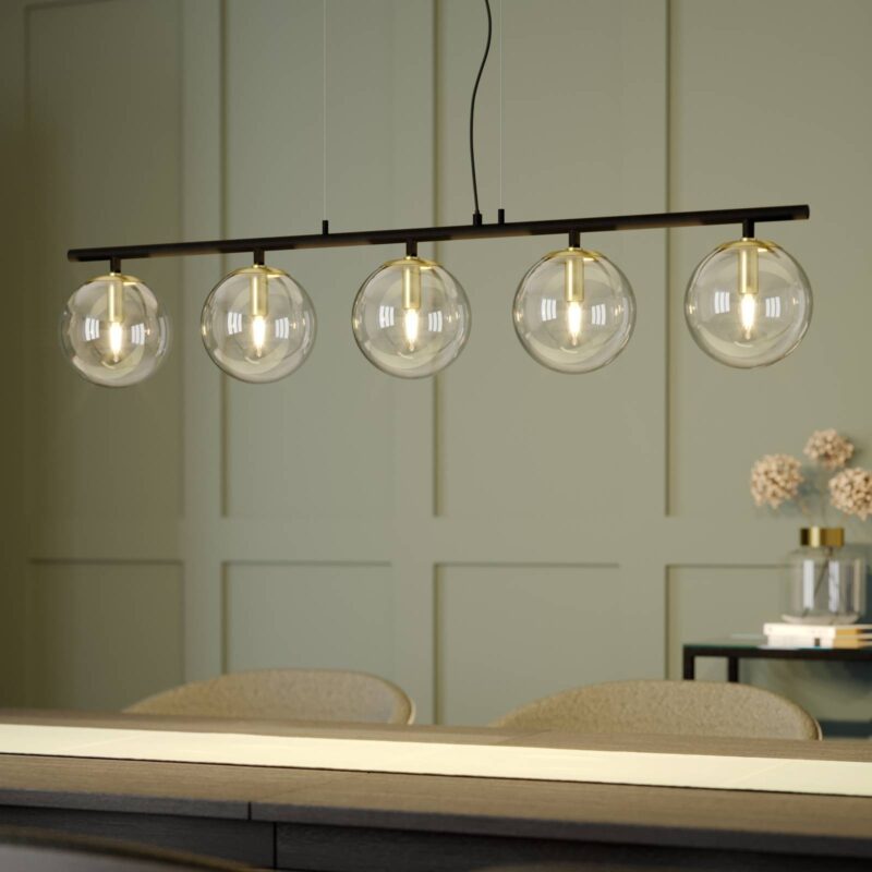 Podlhovastá pásová závesná lampa Sotiana s 5 tienidlami v tvare gule Sotiana je elegantný zdroj svetla s kvalitným dizajnom do jedálenského priestoru, ktorý má päť čírych sklených tienidiel. Tieto gule sú pripevnené v rade k čiernej kovovej tyči, ktorá je úzka a filigránsky spracovaná. Veľmi viditeľné objímky svietidiel sú tiež vyrobené z kovu, ale pre pekný kontrast majú mosadzný vzhľad. Vzniká tak istým spôsobom vzhľad troch komponentov, ktorý vyzerá moderne, ale cítiť v ňom aj trochu nostalgie, takže závesná lampa Sotiana je jedným zo svetelných zdrojov, ktoré sa môžu spájať s populárnym vzhľadom vintage, pričom naozaj klasický dizajn lampy tu má naozaj príťažlivú novú interpretáciu a spája nádych luxusu s určitou lineárnosťou, takže lampa sa môže dobre začleniť do niekoľkých štýlov zariadenia. Pretože v dizajne so sklom prevládajú žiarovky, mali by sa v lampe Sotiana podľa možnosti použiť štýlové vláknové žiarovky v tvare kvapky. Na jasné a štýlové osvetlenie stola v jedálni!