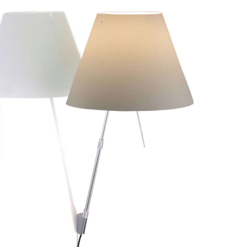 Nástenné svietidlo Costanza so stmieva? a teleskopickým ramenom Dizajn nástennej lampy Costanza je založený na klasických stolových a podlahových lampách: tyče s tienidlo na lampu. Tyč nástenného svietidla má tiež teleskopické rameno, pomocou ktorého je možné lampu výškovo nastaviť od 76 do 110 cm. Kónicky tvarované tienidlo na lampu je vyrobené z polykarbonátu a bolo sieťotlačené. Na spodnom konci obrazovky vyčnieva malá tyčinka, ktorá slúži na zapínanie a vypínanie, ako aj na stmievanie (v štyroch stupňoch). – vrátane napájacieho vedenia a zástrčky