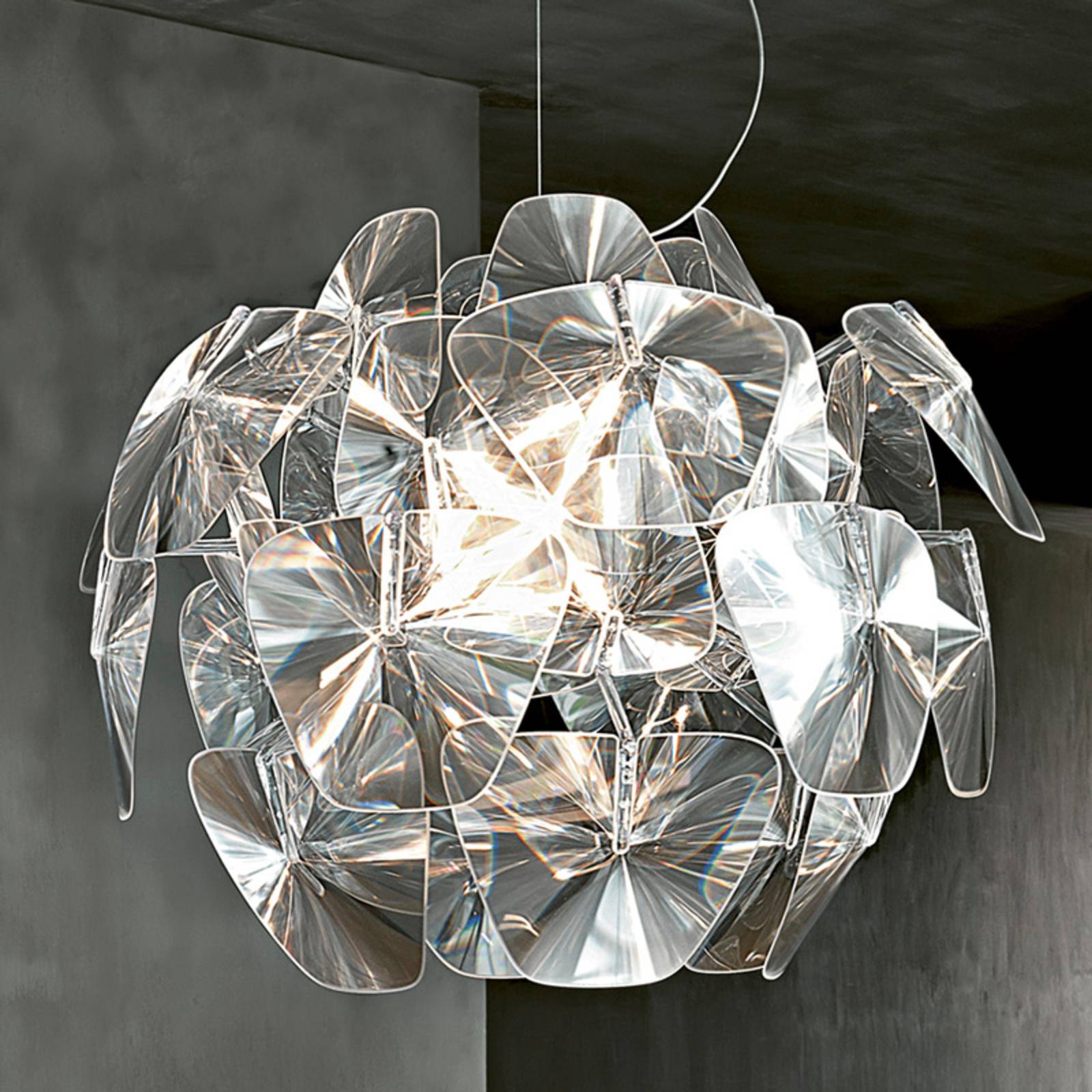 Hope – špeciálny druh priehľadnej závesnej lampyPriehľadná závesná lampa Hope, ktorej tienidlo pozostáva z mnohých jednotlivých Fresnelových šošoviek z polykarbonátu, má mimoriadne ľahký vzhľad. Tenké šošovky boli usporiadané tak, aby sa prekrývali a vytvorili guľovité tienidlo, ktoré zaujme svojou ľahkosťou a priehľadnosťou. Prostredníctvom množstva šošoviek sa svetlo osvetľovacieho telesa znásobuje a v miestnosti sa vytvára trblietavá, slávnostná atmosféra s tisíckami svetelných odrazov. Fascinujúce závesné svietidlo Hope navrhli Francisco Gomez Paz a Paolo Rizzatto a už po vypnutí je v miestnosti jedinečnou pastvou pre oči, pretože tak ako sa iluminátory odrážajú od hranolov, láme sa v nich aj denné svetlo a vytvára svetelné odrazy.