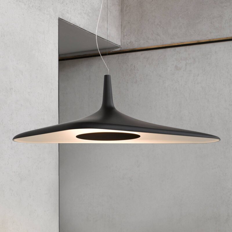 Futuristicky vyzerajúce závesné svietidlo LED Soleil NoirSoleil Noir pochádza z francúzštiny a znamená „čierne slnko“. A práve táto asociácia sa vám okamžite vybaví pri pohľade na dizajn tohto závesného svietidla. S dĺžkou 120 cm a šírkou 62,5 cm visí tienidlo elegantne a ladne na jemnom povrazovom závese, akoby sa takmer magicky vznášalo v miestnosti. Zvonka je čierne, zatiaľ čo vnútro je snehobiele. Teplé biele svetlo LED sa vďaka kovovému prvku pod tienidlom nádherne nepriamo odráža do okolia, kde vytvára príjemnú atmosféru v miestnosti. závesné svietidlo Soleil Noir LED je jedným z mnohých majstrovských diel francúzskej dizajnérky svietidiel Odile Decq, ktorá už získala rôzne ceny a ocenenia za dizajn. – stmievateľné pomocou stmievača Dali (nie je súčasťou dodávky)