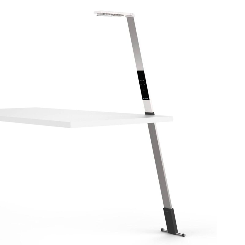 Bezdrôtová, stmievateľná stojacia lampa Luctra Flex LED – svietidlo na batérie do kancelárie Táto bezdrôtová stojacia lampa LED Flex je ideálna pre mobilné kancelárie, pracoviská, ktoré sa menia, alebo aj pre zasadacie miesta. Jeho pogumovaná základňa a výškovo nastaviteľný chránič hrán zaisťujú stabilný a bezpečný stojan. V spodnej časti svietidla je integrovaná lítium-iónová batéria s výdržou 25 hodín. Plne nabitá je opäť len za 90 minút. Hlavu svietidla možno otáčať o 180°, čo umožňuje aj nepriame osvetlenie. Keďže stojacia lampa váži len približne 2 kilogramy, môžete ju bez problémov vziať kamkoľvek so sebou. Svietidlo možno zapínať a vypínať pomocou prehľadného dotykového panela, ktorý je integrovaný v strede. Okrem toho je k dispozícii farebné spektrum svetla v troch úrovniach a intenzitu svetla možno ovplyvňovať v piatich úrovniach. Umožňuje to zabudovaná elektronika VITACORE. Stojacia lampa Flex LED sa vyrába v Nemecku a je ručne vyrobená podľa vysokých štandardov kvality. Samozatváracie závesy zaisťujú, že svetlo je vždy nastavené vo vhodnej polohe. Funkcie – Farba svetla nastaviteľná v troch úrovniach: Teplá biela, univerzálna biela a denné svetlo – S lítium-iónovou batériou – Prísne tolerované podklady pre vysokú vernosť farieb – Ovládanie elektronikou VITACORE prostredníctvom dotykového displeja – 2 biele denné a 2 teplé biele LED diódy (CREE) – Intenzita svetla 566 cd