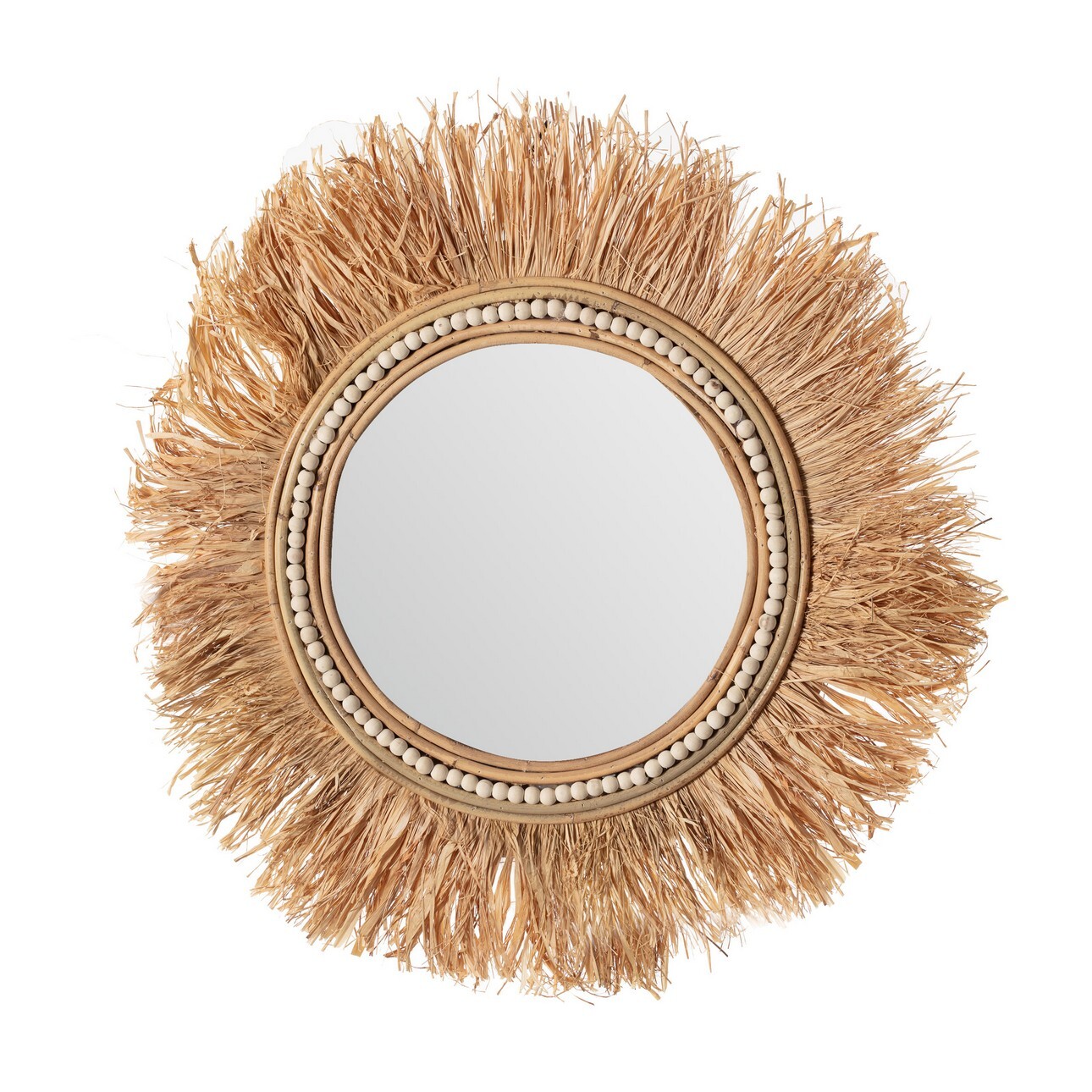 Originálne okrúhle nástenné zrkadlo. Panel zdobí ratanový rám v prírodnej hnedej farbe, ktorý je zakončený sušenou trávou. Tvar zrkadla pripomína exotický ornament prinesený z ďalekých krajín. Dokonale zapadne do interiéru v štýle boho alebo koloniálnom štýle. Tento výrazný dizajnový prvok je tiež zaujímavým nápadom na originálny darček.