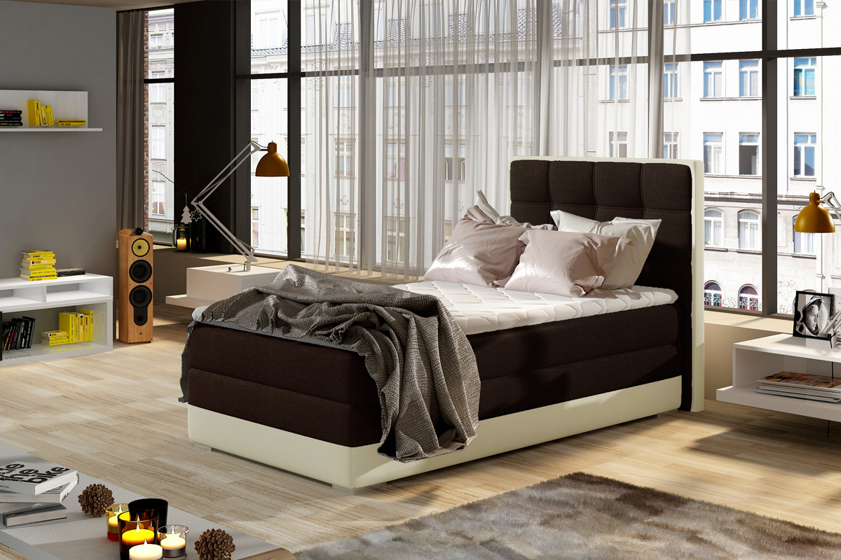 Posteľ BONAMI vás zaujme svojím výnimočným vzhľadom. Poteší aj náročnejších užívateľov. Je vhodná do moderných detských izieb či spální.Posteľ je zaujímavá svojim vysokým čelom. Je celá čalúnená látkou Sawana 26 hnedej farby a ekokožou Soft 33 v krémovom farebnom prevedení. Spacia plocha je vyplnená bonelovými pružinami a kvalitnou PUR penou.Disponuje praktickým úložným priestorom. Otváranie úložného priestoru pravé (viď. foto). V našej ponuke nájdete aj ľavé otváranie úložného priestoru postele.Rozmery postele (š,v,h): 95 x 60/118 x 205 cm.Matrac o veľkosti 90 x 200 cm je v cene postele.Dodávame v demontovanom stave.