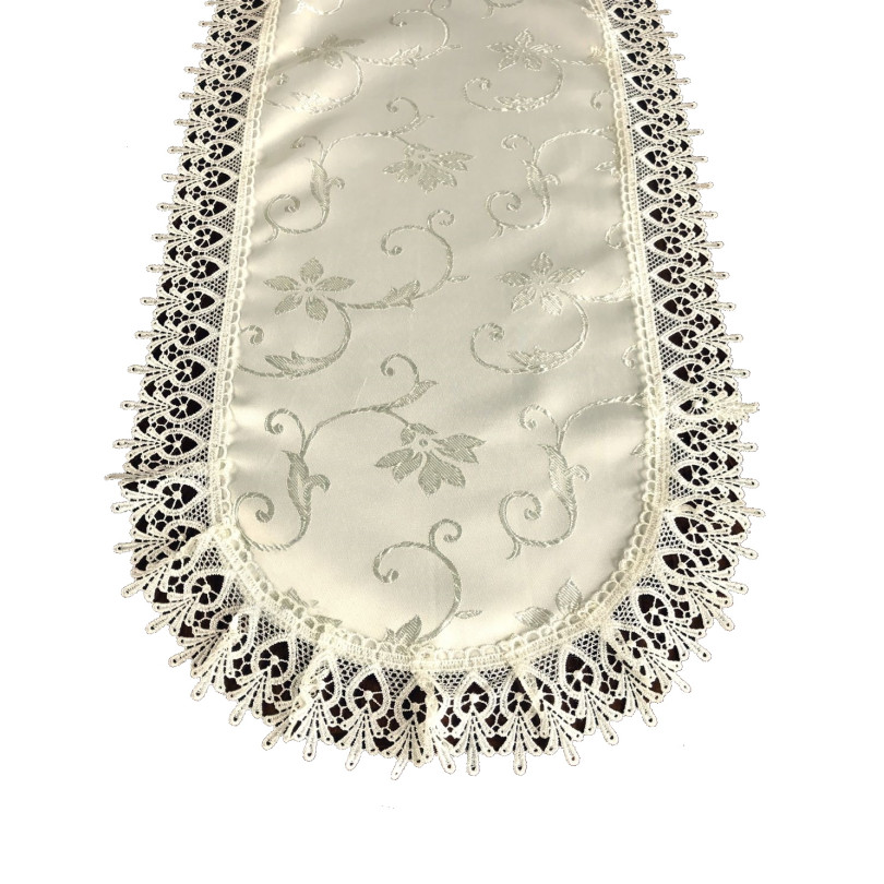 Luxusný béžový oválny obrus s jemnou vyšívkou a krajkou Šírka: 35 cm | Dĺžka: 70 cm