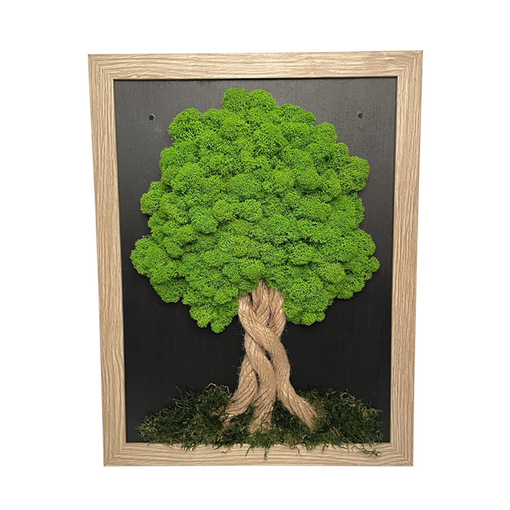 Machový obraz je vyrobený ručne kombináciou prírodného lana a stabilizovaného machu, ktorý prinesie kúsok prírody do vášho interiéru a zaujme na prvý pohľad jedinečným vzhľadom. Vzhľadom na prírodný materiál a vzhľadom nato, že sa jedná o ručnú prácu, sa môže farba produktu mierne líšiť od zobrazenia na webovej stránke, prípadne môže produkt obsahovať jemné praskliny alebo nerovnosti. Každý kus je unikátny originál. Stabilizovaný mach je 100% prírodný materiál, je prakticky bez údržbový, antistatický a antialergénny. Jeho životnosť je 7-10 rokov. Produkty zo stabilizovaného machu:je potrebné chrániť pred priamym slnečným žiarenímneumiestňovať ich nad zdroj teplachrániť pred kontaktom s vodouje potrebné umiestniť do miestnosti s ideálnou vlhkosťou 40-80%Špecifikácie:Farba: plochý mach – prírodný zelený, mach lišajník – svetlozelenýPozadie: čierne pozadieRám: svetlý rámMateriál: lano, stabilizovaný mach, plátnoRozmer: 34 x 44 cmZavesenie: zavesiť pomocou závesného systému na zadnej strane obrazu