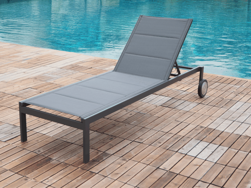 Moderné polohovateľné záhradné lehátko Mallorca v elegantnom dizajne s praktickými kolieskami a rýchloschnúcim textilénovým povrchom.