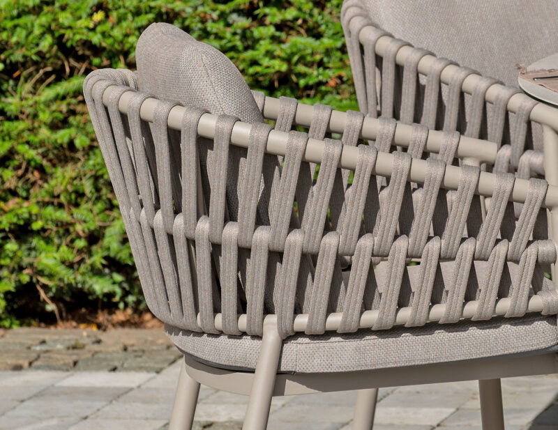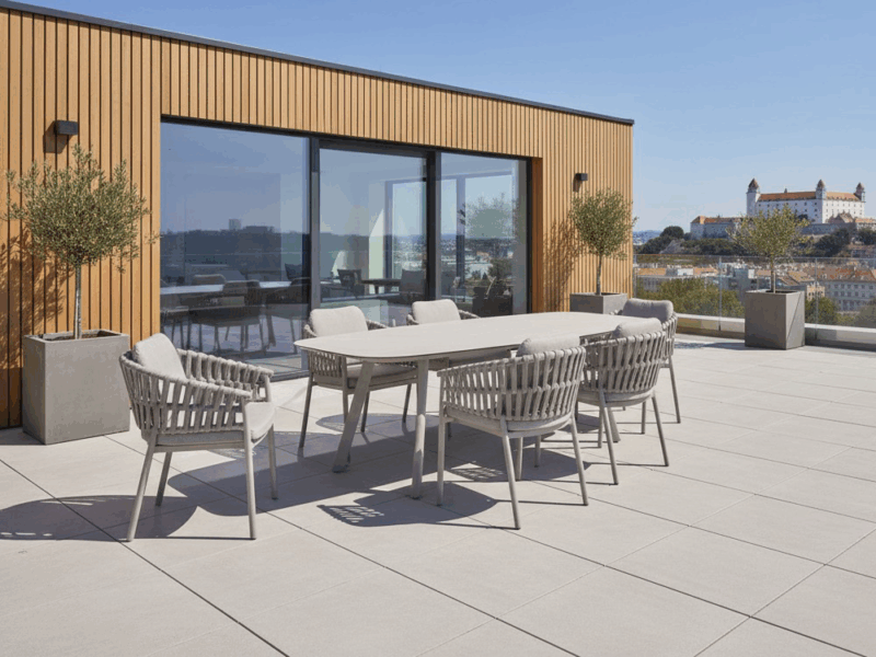 Manolo Catalana stolová súprava v jemnom latte odtieni prináša eleganciu a pohodlie na vašu terasu. Oválny stôl Manolo s odolnou keramickou doskou a 6 štýlových stoličiek Catalana s rope výpletom a pohodlným sedením je ideálnou voľbou pre vonkajšie stolovanie.