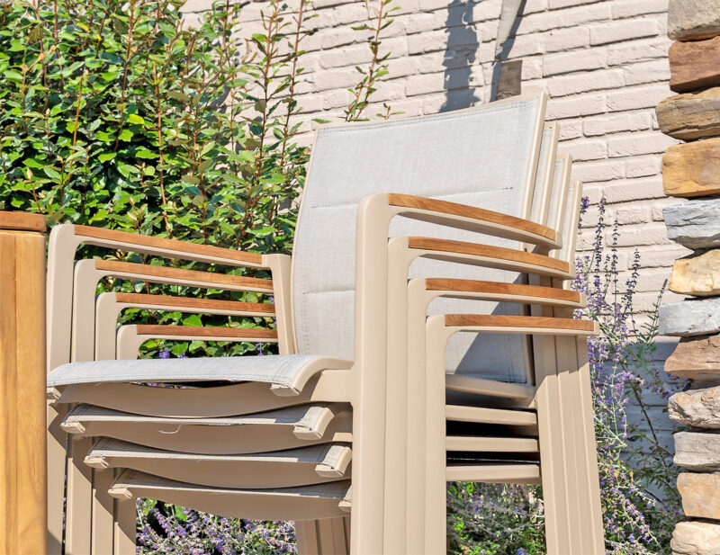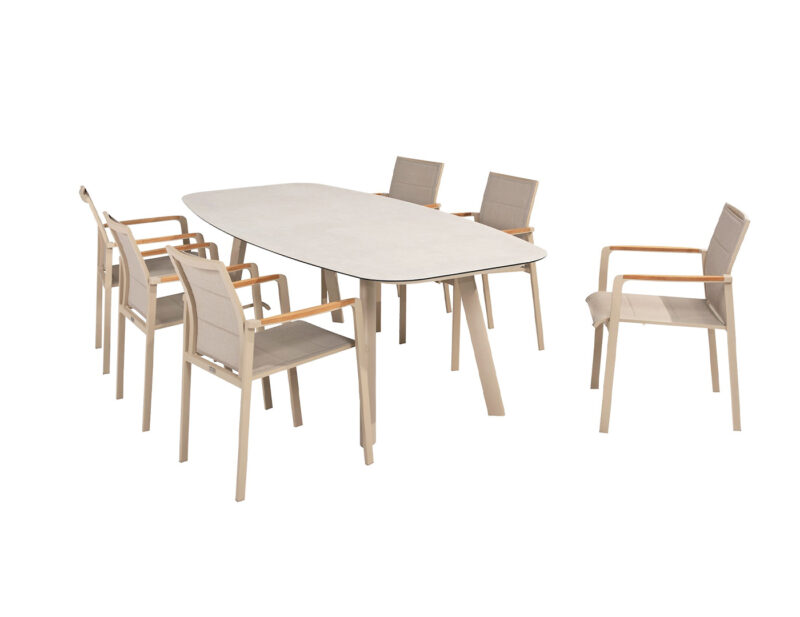 Manolo Cortina stolová súprava v elegantnom latte odtieni je ideálnym riešením pre vonkajšie stolovanie. Oválny stôl Manolo s odolnou keramickou doskou a 6 stoličiek Cortina s hliníkovým rámom, textilénovým sedadlom a teakovými podrúčkami spájajú moderný dizajn s praktickosťou a pohodlím.