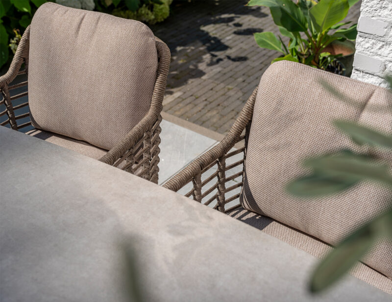 Manolo Puglia stolová súprava v latte odtieni spája eleganciu a komfort do jedného celku. Oválny stôl Manolo s odolnou keramickou doskou a stabilnou hliníkovou konštrukciou dopĺňa šesť pohodlných jedálenských stoličiek Puglia s rope výpletom a mäkkými poduškami. Táto súprava je ideálna na spoločné chvíle pri stole v exteriéri.