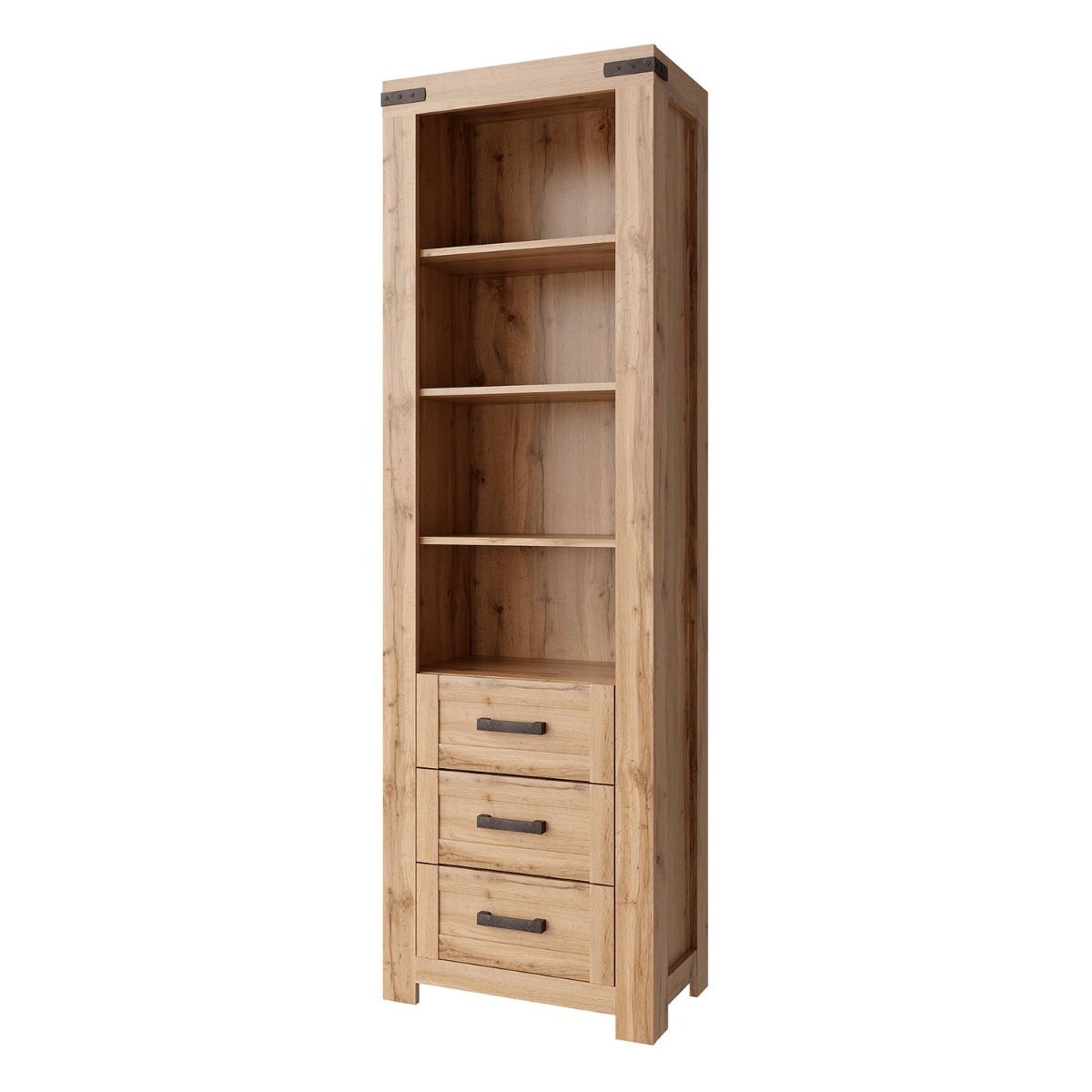 Objavte štýlový nábytok MARIETTA – elegancia a praktickosť pre váš domovZariaďte si obývačku, spálňu, jedáleň či predsieň moderným sektorovým nábytkom MARIETTA. Tento dizajnovo prepracovaný systém v odtieni dub Wotan prináša teplý prírodný vzhľad, ktorý vytvorí útulnú atmosféru v každej miestnosti. Kombinácia laminovanej drevotriesky a kvlaitného MDF na dvierkach, spolu s plastovými úchytkami zaručujú dlhú životnosť a jednoduchú údržbu. Otvorený regál MARIETTA – štýlový úložný priestor s praktickým aj dekoračným využitím.Zvýraznite dizajn vašej obývačky alebo jedálne s úzkym regálom MARIETTA v elegantnom štýle. Regál ponúka kombináciu praktického úložného priestoru a možnosti vystavenia dekorácií. Obsahuje tri praktické zásuvky a regál s policami – ideálne na porcelán, knihy alebo upomienkové predmety. Farebné prevedenie: dub WotanMateriál: LTD/MDFRozmery: (ŠxHxV): 64,8 x 40,1 x 210,1 cmVýška nožičiek: 7 cmProdukt je dodávaný v demonte s prehľadným návodom na montáž.