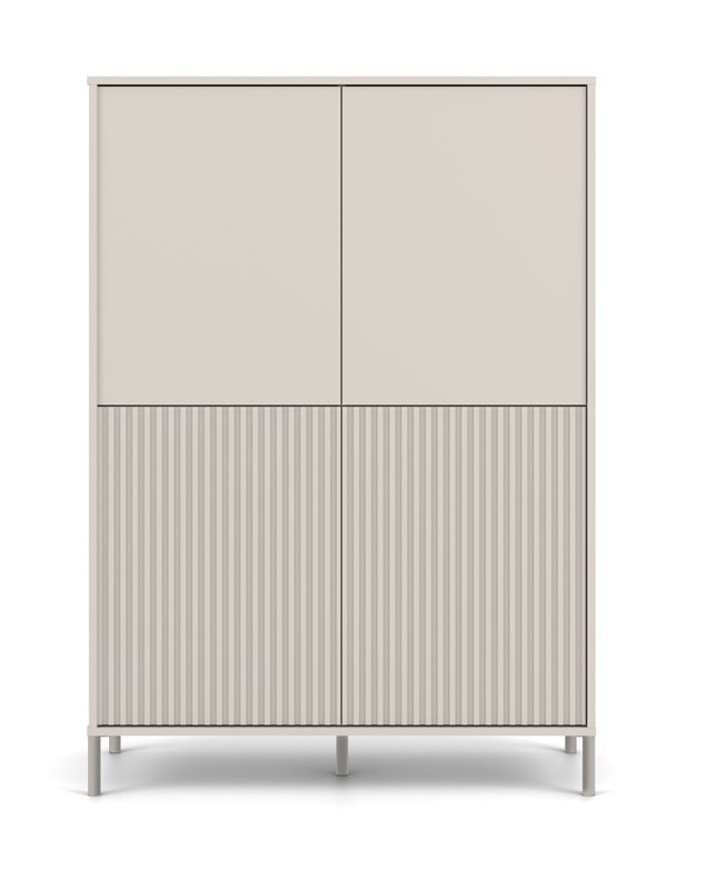 MARIKA štvordverová skrinka 4DK je kombináciou estetiky a funkčnosti, ktorá sa perfektne hodí do obývačky v akomkoľvek štýle. Vďaka drážkovaným predným častiam (pripomínajúcim lamely) získava nábytok moderný a originálny vzhľad, ktorý dokonale ladí so súčasnými interiérmi. Moderný systém TIP-ON umožňuje pohodlné používanie bez úchytiek – stačí jemne stlačiť dvierka a skrinka sa otvorí. Štvordverová skrinka ponúka veľký úložný priestor a zároveň si zachováva minimalistický a elegantný charakter, ktorý sa hodí do mnohých aranžmánov. Kombinácia módneho odtieňa s moderným dizajnom vytvára kus nábytku, ktorý dodá vášmu interiéru jemnú eleganciu, štýl a poriadok.MATERIÁL:Korpus: laminovaná drevotrieska s hrúbkou 16 mmDrážkovaná predná strana dverí: Melamínová MDF doska, frézovaná a potiahnutá 18 mm hrubou fóliouPánty: Kov/oceľ s jemným nastavenímNohy : Kov/oceľ, výška 13,5 cmROZMERY:Šírka: 103,5 cmVýška: 147,5 cmHĺbka: 40 cmSTAROSTLIVOSŤ:Povrch nábytku čistite mäkkou, suchou handričkou.Vyhnite sa používaniu agresívnych chemikálií a abrazívnych prostriedkov.Dodávame v demontovanom stave, montážny návod je súčasťou balenia.