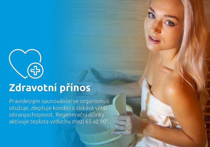 zdravotný prínos pravidelným saunovaním sa organizmus otužuje, zlepšuje kondíciu a získava väčšiu obranyschopnosť, regeneračné účinky aktivuje teplota vzduchu medzi 65 až 90 °