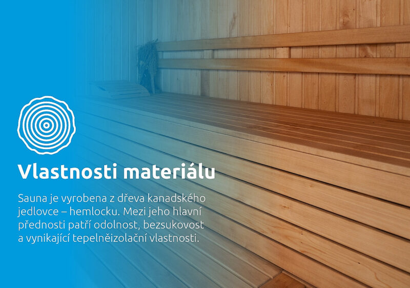 vlastnosti materiálu sauna je vyrobená z dreva kanadského jedľovca – hemlocku, medzi jeho hlavné prednosti patrí odolnosť, bezsukovosť a vynikajúce tepelnoizolačné vlastnosti