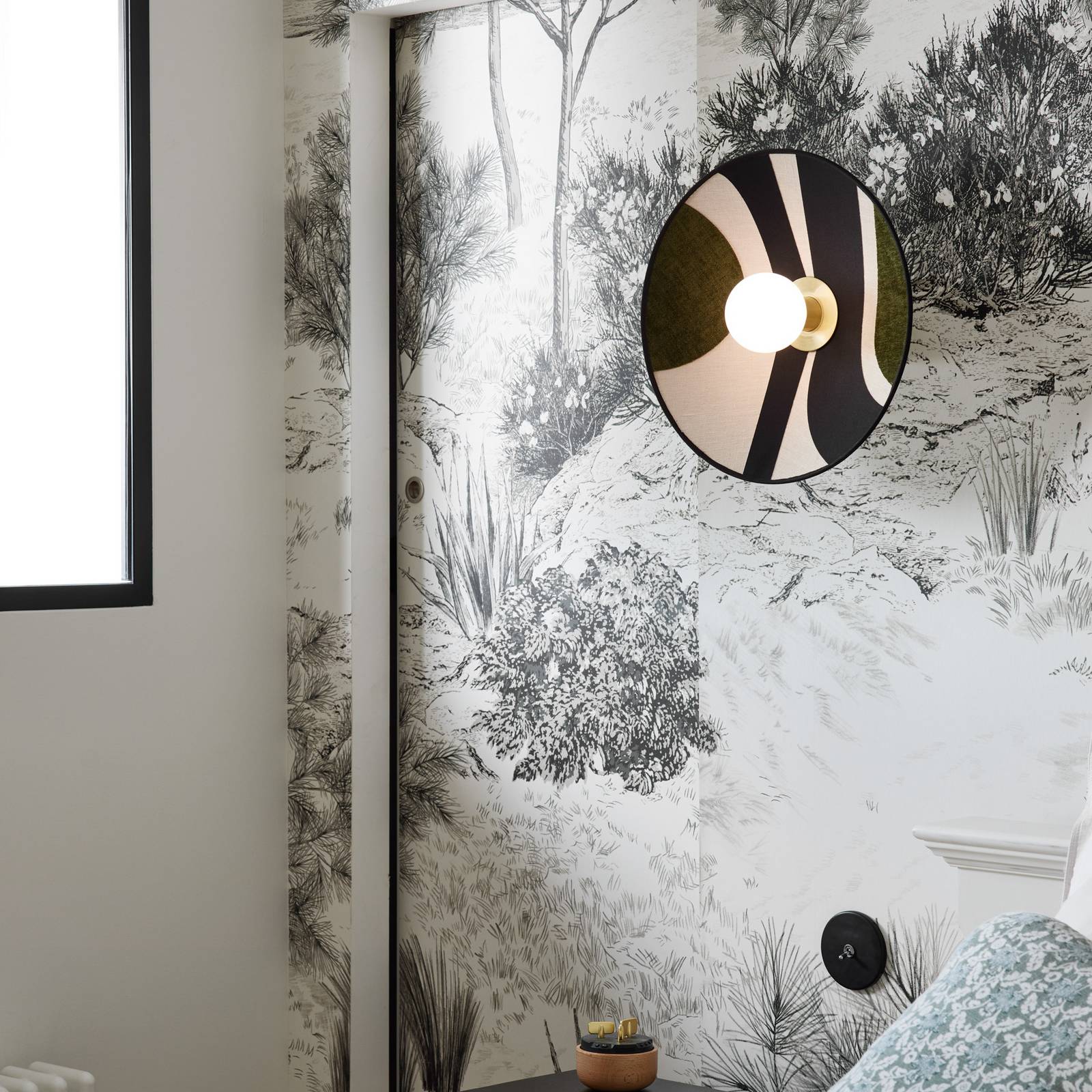 Toto nástenné svetlo Sonia Laudet s dekoratívnym vzorovaným textilným tienidlom Toto nástenné svetlo pôsobí už v vypnutom stave ako pútavý prvok v každej miestnosti vďaka dekoratívnemu vzoru textilného tienidla, ktoré obklopuje rám z pieskovaného kovu. Akonáhle sa svetlo zapne, svetlo použitej žiarovky bez prekážok osvetľuje okolie. Výberom dekoratívnej žiarovky, ktorú je možné objednať ako príslušenstvo, je možné ešte zvýšiť estetický dojem nástenného svetla Sonia Laudet. S touto nástennou lampou môžete nielen dosiahnuť atmosférické doplnkové osvetlenie v obývacích izbách, spálňach a chodbách, ale aj veľmi dekoratívne zvýrazniť interiér. Táto séria svietidiel je výsledkom spolupráce medzi francúzskou dizajnérkou Sonia Laudet a značkou svietidiel MARKET SET.