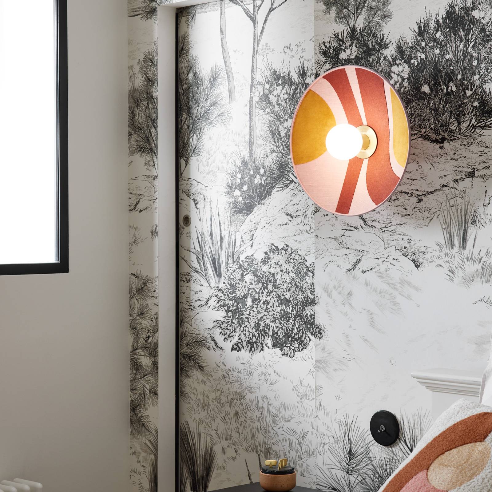 Toto nástenné svetlo Sonia Laudet s dekoratívnym vzorovaným textilným tienidlom Toto nástenné svetlo pôsobí už v vypnutom stave ako pútavý prvok v každej miestnosti vďaka dekoratívnemu vzoru textilného tienidla, ktoré obklopuje rám z pieskovaného kovu. Akonáhle sa svetlo zapne, svetlo použitej žiarovky bez prekážok osvetľuje okolie. Výberom dekoratívnej žiarovky, ktorú je možné objednať ako príslušenstvo, je možné ešte zvýšiť estetický dojem nástenného svetla Sonia Laudet. S touto nástennou lampou môžete nielen dosiahnuť atmosférické doplnkové osvetlenie v obývacích izbách, spálňach a chodbách, ale aj veľmi dekoratívne zvýrazniť interiér. Táto séria svietidiel je výsledkom spolupráce medzi francúzskou dizajnérkou Sonia Laudet a značkou svietidiel MARKET SET.