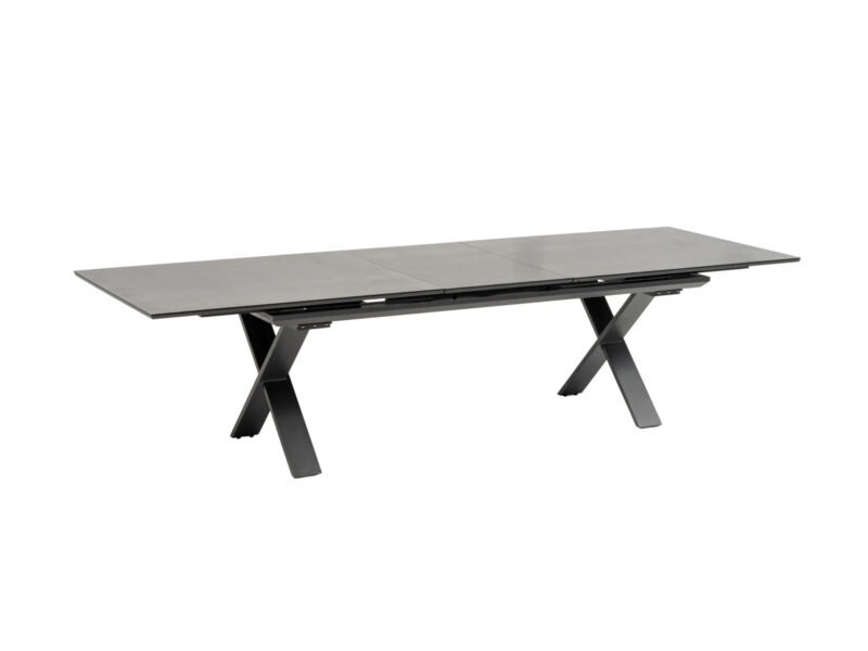 Rozťahovací jedálenský stôl Marlow s antracitovým hliníkovým podstavcom a sklenenou doskou s keramickým povrchom ponúka elegantný vzhľad, stabilitu a praktickú možnosť zväčšenia plochy.