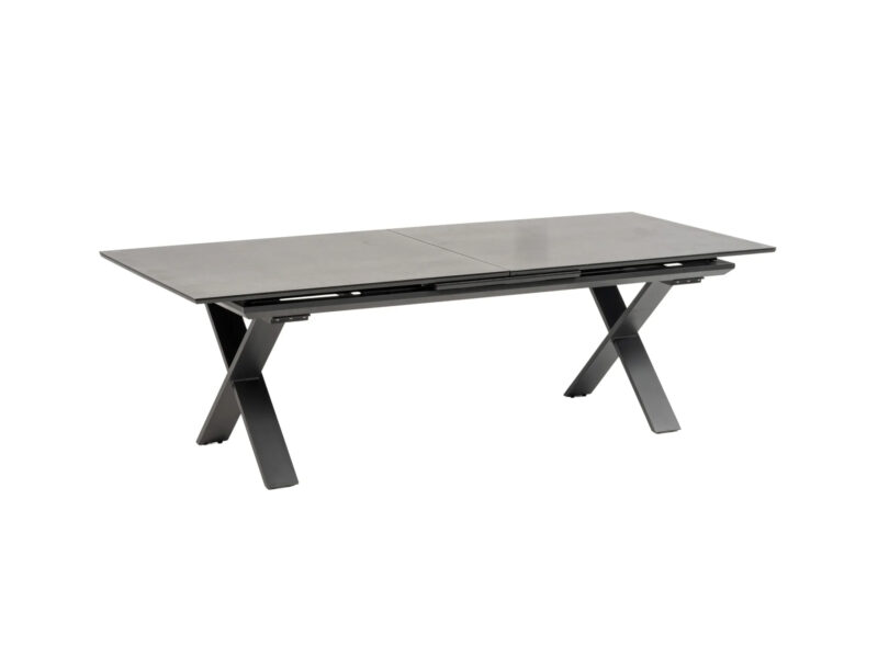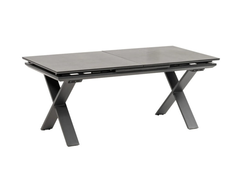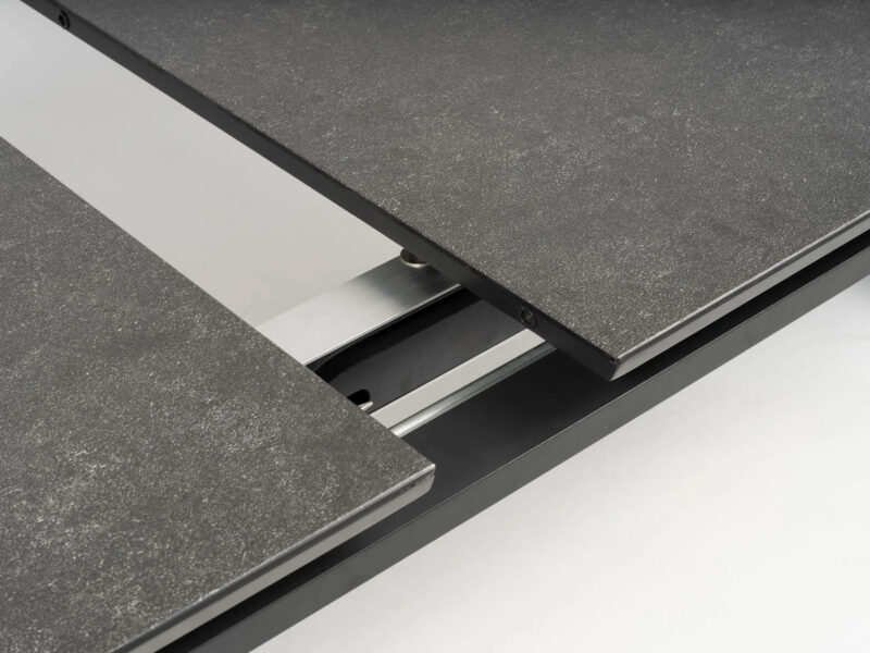 Rozťahovací jedálenský stôl Marlow s antracitovým hliníkovým podstavcom a sklenenou doskou s keramickým povrchom ponúka elegantný vzhľad, stabilitu a praktickú možnosť zväčšenia plochy.