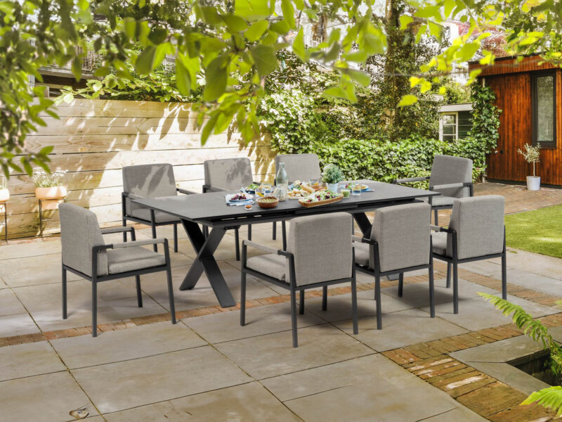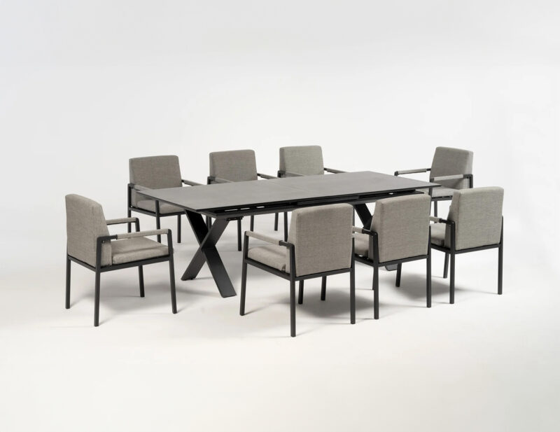 Stolová súprava Marlow premení každé vonkajšie posedenie na príjemný zážitok. Osem pohodlných kresiel a rozťahovací stôl s keramickou doskou ponúkajú dostatok priestoru pre spoločné chvíle. Stabilná antracitová konštrukcia odolá akémukoľvek počasiu.