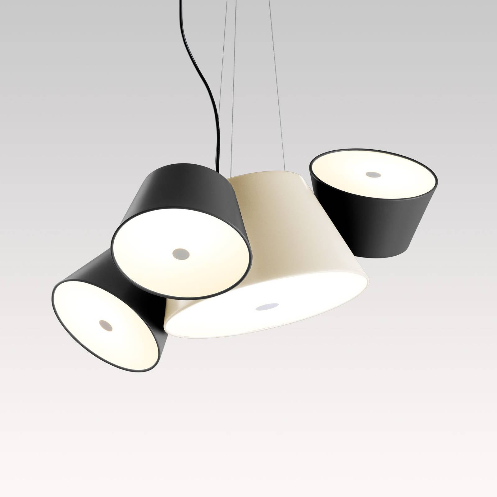 Matná povrchová úprava: Závesné svietidlo Tam Tam Mini s centrálnym tienidlom a tromi pohyblivými satelitmi, bez oslneniaDizajn moderného závesného svietidla Tam Tam Mini pochádza z pera dizajnéra Fabiena Dumasa, ktorý ním chcel vytvoriť pocit organizovaného chaosu. V strede sa nachádza veľké tienidlo, ktoré svieti pevne smerom nadol. Z vonkajšej strany sú pripevnené tri menšie tienidlá, ktoré sa dajú otáčať, a tak nastaviť podľa potreby. Vo veľkom tienidle sú umiestnené dve žiarovky E27 a v malých satelitoch je umiestnená každá žiarovka E27 (pozri príslušenstvo). Svetelnú náladu tak možno ovplyvniť výberom vhodného svetelného zdroja a v prípade potreby možno tienidlá osadiť rôznymi žiarovkami. Všetky tienidlá sú vybavené opálovým bielym difúzorom, ktorý zabezpečuje homogénne a neoslňujúce vyžarovanie svetla. Tam Tam Mini sa opiera o tri laná, ktoré sa na strope končia kruhovým a plochým vrchlíkom. Toto estetické závesné svietidlo presvedčí ako moderný dizajnový prvok v interiéri, aj keď je svetlo vypnuté. Tam Tam Mini vyrába španielsky výrobca Marset, ktorý je známy inovatívnym dizajnom a vysokou kvalitou.