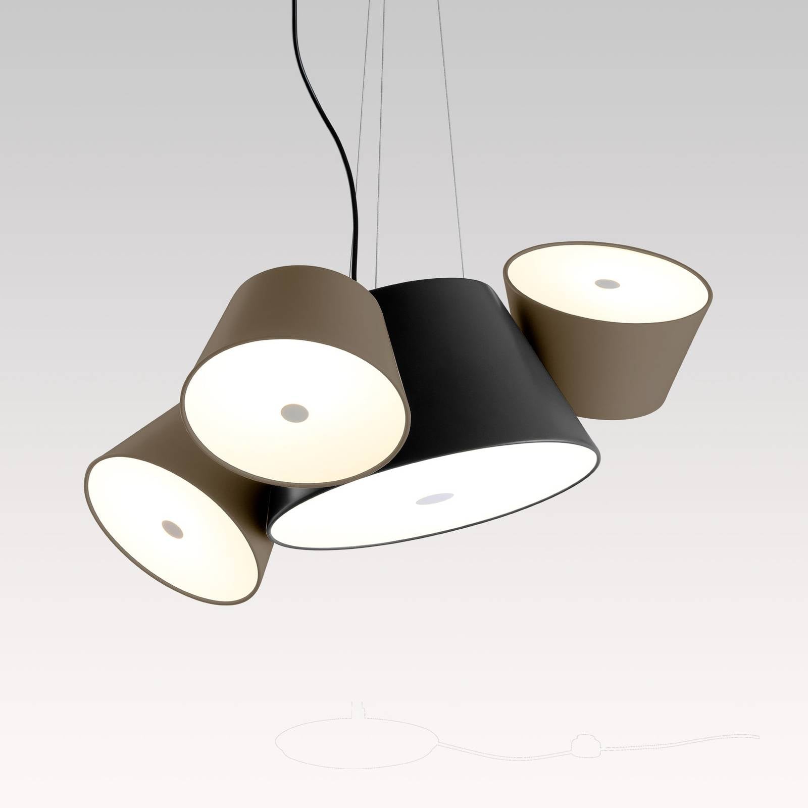 Matná povrchová úprava: Závesné svietidlo Tam Tam Mini s centrálnym tienidlom a tromi pohyblivými satelitmi, bez oslneniaDizajn moderného závesného svietidla Tam Tam Mini pochádza z pera dizajnéra Fabiena Dumasa, ktorý ním chcel vytvoriť pocit organizovaného chaosu. V strede sa nachádza veľké tienidlo, ktoré svieti pevne smerom nadol. Z vonkajšej strany sú pripevnené tri menšie tienidlá, ktoré sa dajú otáčať, a tak nastaviť podľa potreby. Vo veľkom tienidle sú umiestnené dve žiarovky E27 a v malých satelitoch je umiestnená každá žiarovka E27 (pozri príslušenstvo). Svetelnú náladu tak možno ovplyvniť výberom vhodného svetelného zdroja a v prípade potreby možno tienidlá osadiť rôznymi žiarovkami. Všetky tienidlá sú vybavené opálovým bielym difúzorom, ktorý zabezpečuje homogénne a neoslňujúce vyžarovanie svetla. Tam Tam Mini sa opiera o tri laná, ktoré sa na strope končia kruhovým a plochým vrchlíkom. Toto estetické závesné svietidlo presvedčí ako moderný dizajnový prvok v interiéri, aj keď je svetlo vypnuté. Tam Tam Mini vyrába španielsky výrobca Marset, ktorý je známy inovatívnym dizajnom a vysokou kvalitou.