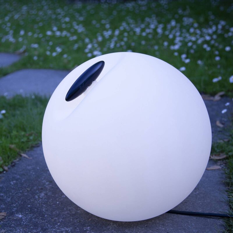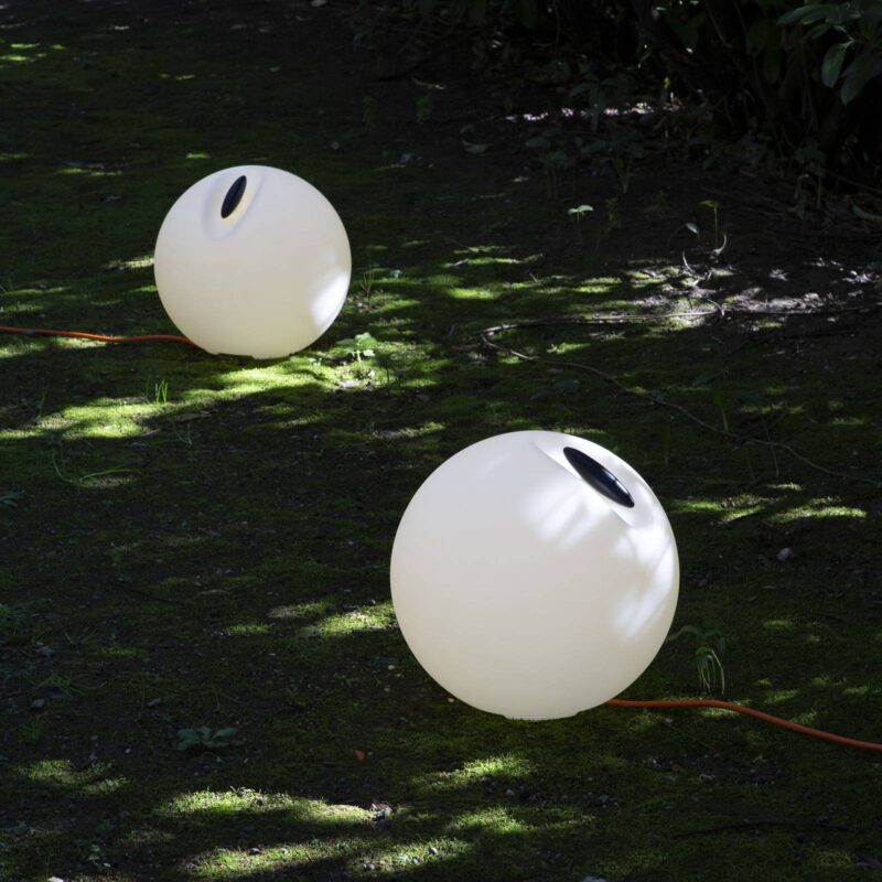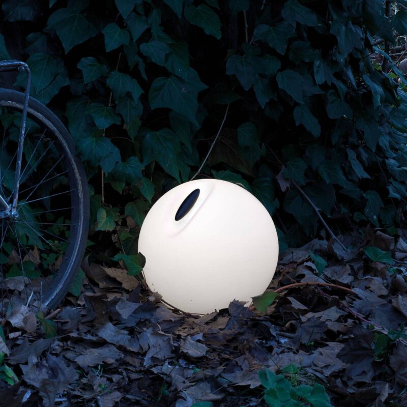 Sférická misa na lampu pre vonkajšiu dekoráciu Misa je ideálna na nastavenie atraktívnych svetelných akcentov v záhradách a parkoch, vo vstupných priestoroch alebo na terasách. Lampa je vyrobená v tvare gule z opálového polyetylénu; materiál vyžaruje svetlo žiarovky E27, ktoré sa má používať (pozri príslušenstvo) rovnomerne zo všetkých strán. Na prenášanie dekoračnej lampy na požadované miesto je integrovaná rukoväť z čiernej syntetickej živice. Kábel s oranžovým plášťom je vybavený externým konektorom IP44. Misa vonkajšej lampy bola navrhnutá Sergeom a Robertom Cornelissenmi. Belgickí dizajnéri sa zameriavajú predovšetkým na architektonické osvetlenie. Výrobu realizuje talianska spoločnosť Martinelli Luce, ktorej svetlá sú oceňované pre svoju bezchybnú kvalitu.