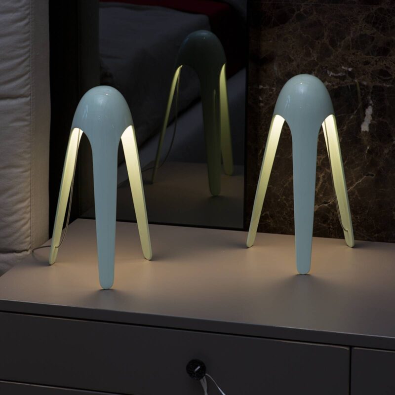 Vyrobené v Taliansku – nezvyčajná stolová lampa Cyborg LED v jemných pastelových farbách Dizajn tejto stolovej lampy je rovnako mystický, ako znie názov „Cyborg“, s hrbatým tvarom a trojnohým rámom pripomínajúcim bytosť alebo predmet z budúcnosti. Horná časť svietidla z tlakovo liateho hliníka ukrýva trvalo nainštalované LED diódy, ktoré po zapnutí – dotykom hlavy rámu – vyžarujú teplé biele svetlo smerom nadol cez satinovaný polykarbonátový difúzor a vyčarujú veľmi príjemnú svetelnú atmosféru bez oslnenia. Stolová lampa Cyborg vďačí za svoj osobitý dizajn svojmu tvorcovi, americkému dizajnérovi Karimovi Rashidovi, ktorý už získal niekoľko ocenení za dizajn za svoje originálne návrhy svietidiel a navrhol svietidlo v mene talianskeho prémiového výrobcu Martinelli Luce.