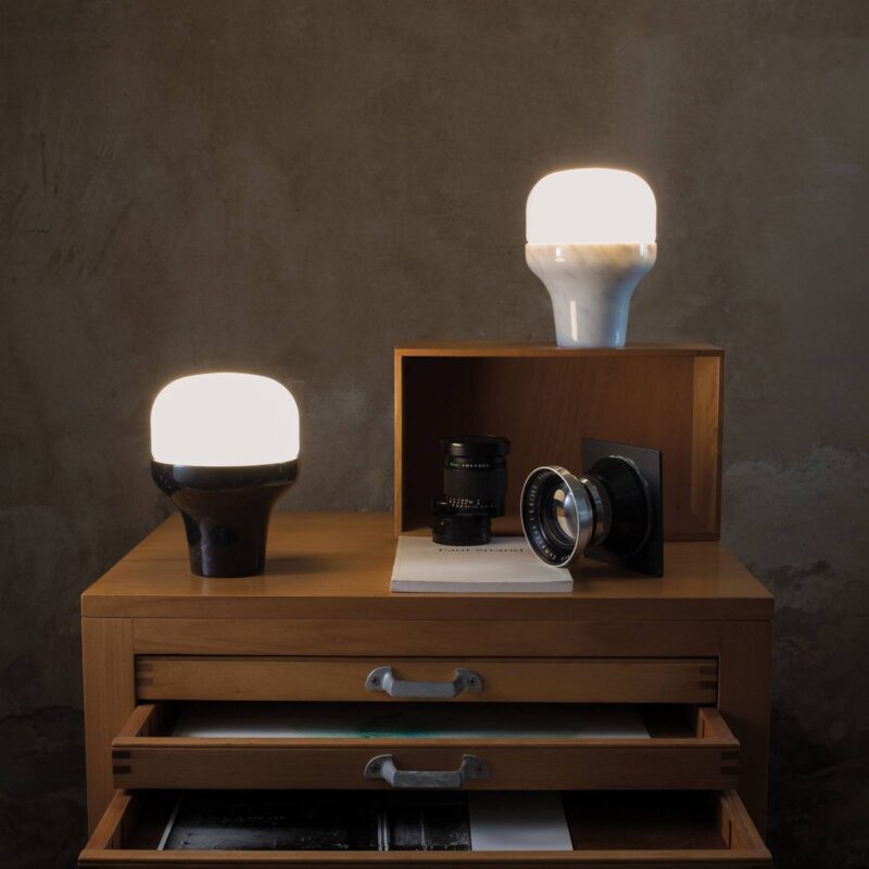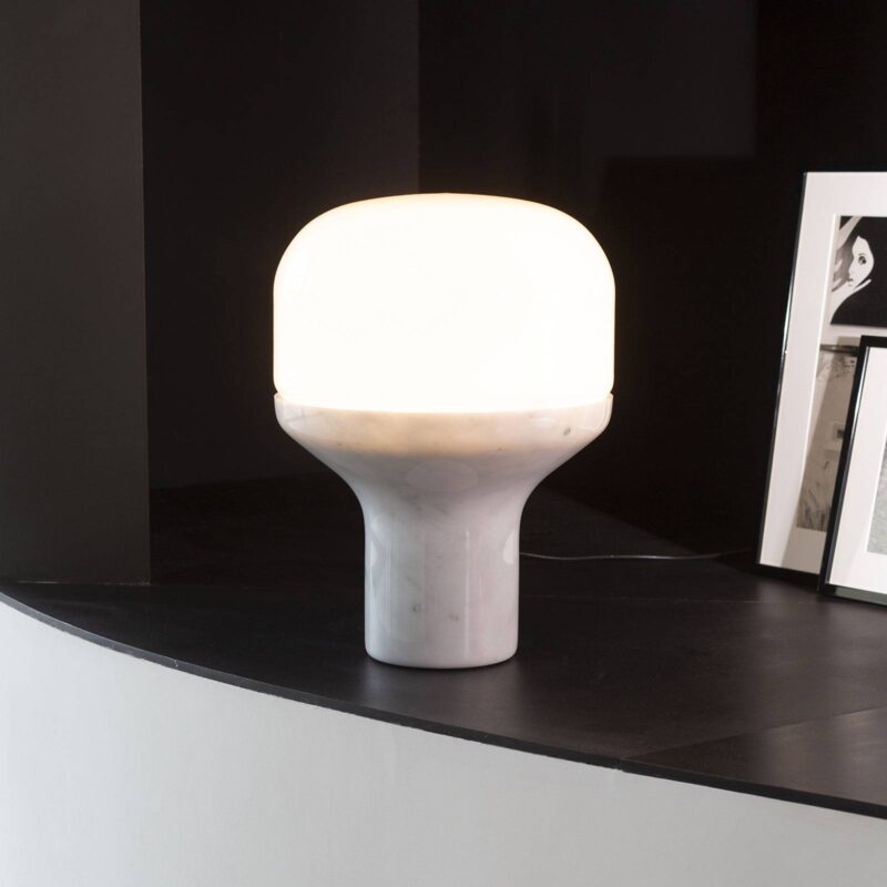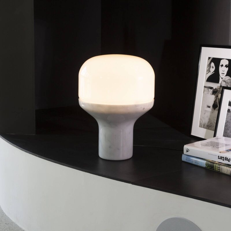 Okrúhla stolová lampa Delux s mramorovou základňou a tienidlom z opálového skla Stolová lampa Delux vyzerá so svojou charakteristickou zmesou materiálov elegantne a luxusne. Noha vyrobená z mramoru má v Basis valcovitý tvar a smerom hore sa zväčšuje po obvode. Tu chodidlo takmer hladko splýva s tienidlo na lampu . Posledné z nich pozostáva z fúkaného opálového skla a na vrchu je harmonicky zakrivené. tienidlo na lampu zaisťuje rovnomerný lom svetla, takže Delux vyplňuje okolie príjemne mäkkým svetlom zo všetkých strán. Delux je dizajn, ktorý v roku 2019 predstavili dizajnéri štúdia natural, Marco De Santi a Alessandro Paoletti. Spoločnosť Martinelli Luce vyrába stolnú lampu v obvyklej vysokej kvalite, ktorá odlišuje výrobky talianskeho výrobcu.