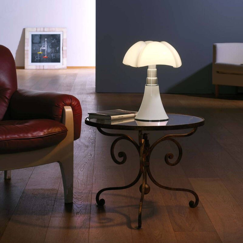 Senzačná LED stolová lampa Minipipistrello Stolová lampa Minipipistrello („malý netopier“) je absolútnym umeleckým predmetom, pretože jej štvorčlenný opálový biely tienidlo na lampu v metakryláte pripomína v skutočnosti trochu roztiahnuté krídla netopiera. Jeho teleskopická pätica žiarovky vyrobená z vysoko kvalitnej nehrdzavejúcej ocele robí z lampy nezameniteľný vrchol v obývacej izbe. Svetlo je emitované difúzne a bez oslnenia cez opálové tienidlo na lampu , čo vytvára príjemnú svetelnú atmosféru. Svietidlá zo série Pipistrello už získali niekoľko ocenení za dizajn. Dizajn vytvoril v roku 1965 Gaetana „Gae“ Aulenti (1927 – 2012), ktorá je známa svojimi početnými prácami v oblasti architektúry a dizajnu. Rovnako ako teraz preberá výrobu taliansky výrobca osvetlenia Martinelli Luce .