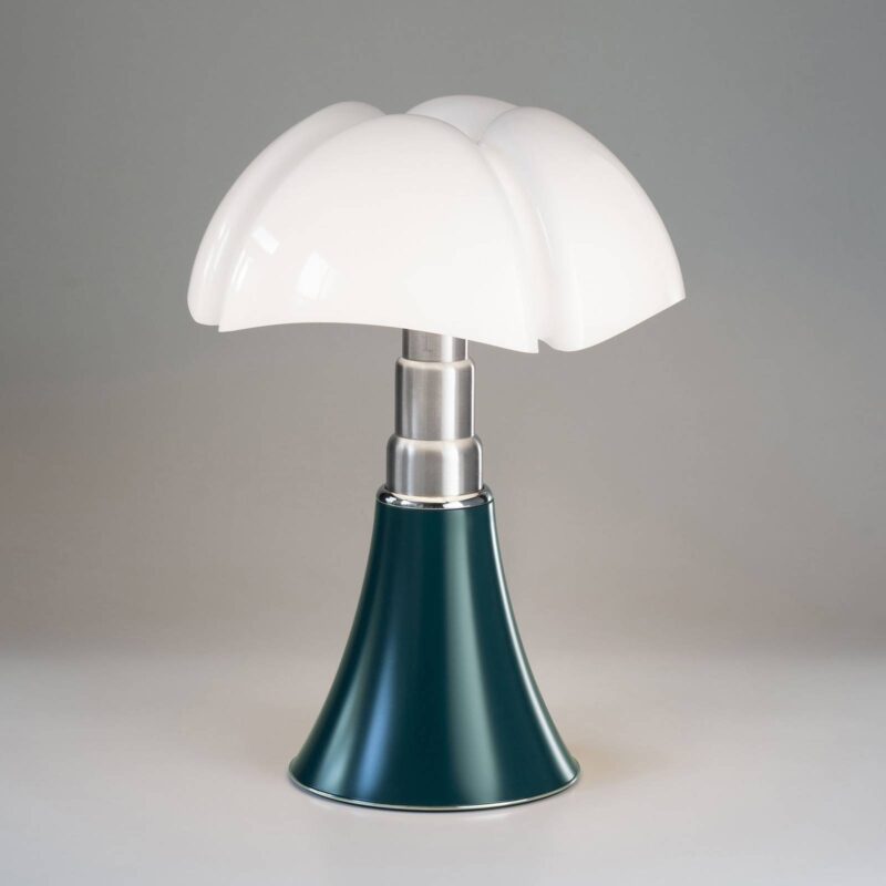 Nadčasová dizajnová stolová lampa Pipistrello Med so stmievačom šnúry Či už je to vintage, moderné alebo kreatívne – LED stolová lampa Pipistrello Med harmonizuje ako kvalitný a atraktívny doplnok s mnohými súčasnými koncepciami vybavenia. Sériu Pipistrello („Fledermaus“) navrhol v roku 1965 taliansky architekt a dizajnér Gaetana „Gae“ Aulenti (1927 – 2012). Odvtedy výrobca Martinelli Luce vyrába sériu žiaroviek v bezchybnej kvalite. Konkávny podstavec sa skladá zo spodnej časti z lakovaného hliníka a hornej výsuvnej časti z nehrdzavejúcej ocele. Na ňom tróni polkruhové tienidlo na lampu vyrobené z opálového metakrylátu, ktoré je rozdelené na štyri časti a pri používaní rovnomerne svieti. Integrované LED diódy je možné ovládať pomocou stmievača na kábli. – nastaviteľná výška od 50 do 62 cm