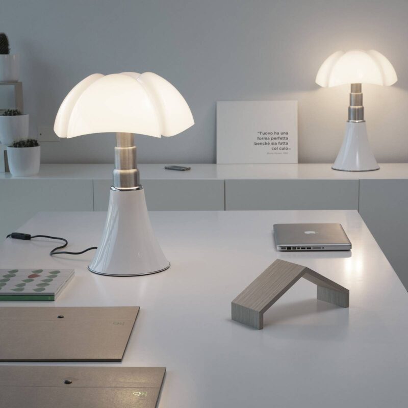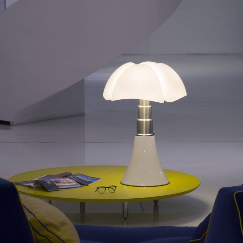 Nadčasová dizajnová stolová lampa Pipistrello Med so stmievačom šnúry Či už je to vintage, moderné alebo kreatívne – LED stolová lampa Pipistrello Med harmonizuje ako kvalitný a atraktívny doplnok s mnohými súčasnými koncepciami vybavenia. Sériu Pipistrello („Fledermaus“) navrhol v roku 1965 taliansky architekt a dizajnér Gaetana „Gae“ Aulenti (1927 – 2012). Odvtedy výrobca Martinelli Luce vyrába sériu žiaroviek v bezchybnej kvalite. Konkávny podstavec sa skladá zo spodnej časti z lakovaného hliníka a hornej výsuvnej časti z nehrdzavejúcej ocele. Na ňom tróni polkruhové tienidlo na lampu vyrobené z opálového metakrylátu, ktoré je rozdelené na štyri časti a pri používaní rovnomerne svieti. Integrované LED diódy je možné ovládať pomocou stmievača na kábli. – nastaviteľná výška od 50 do 62 cm