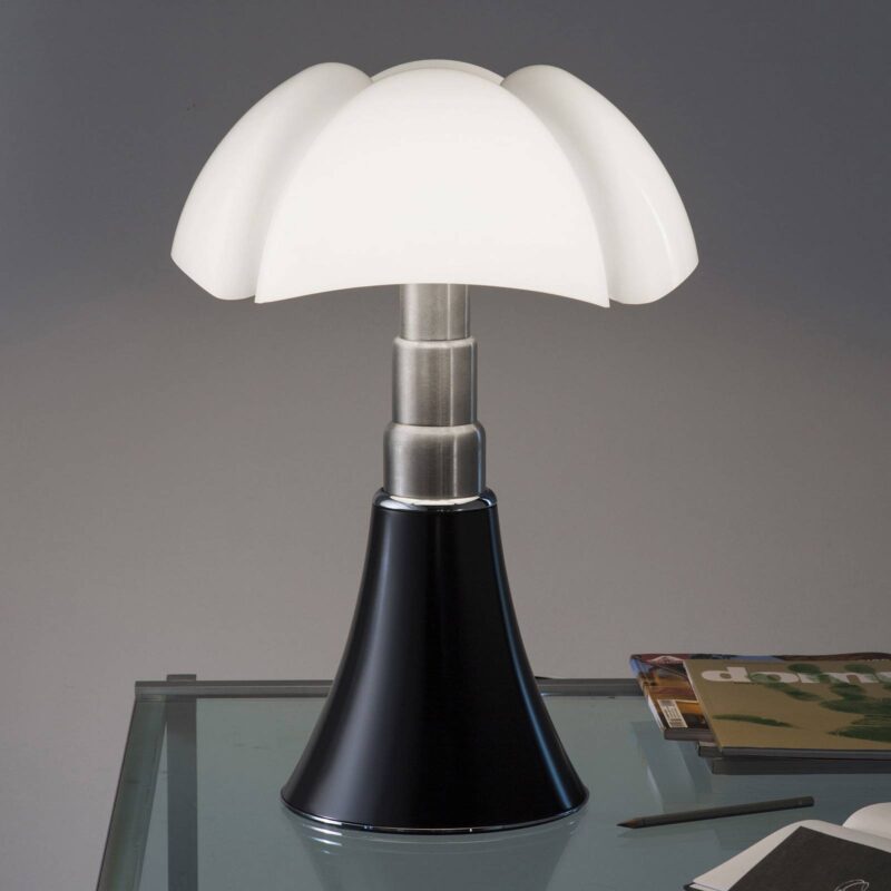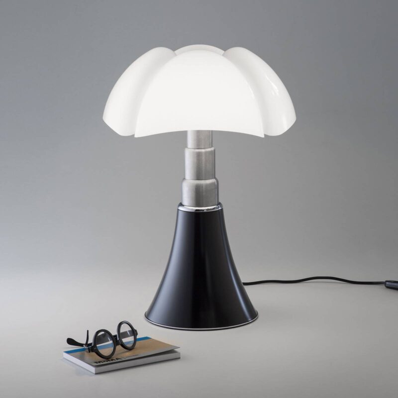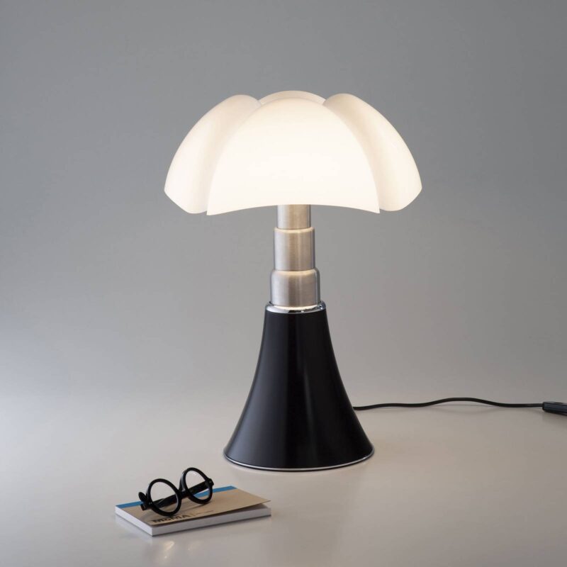 Nadčasová dizajnová stolová lampa Pipistrello Med so stmievačom šnúry Či už je to vintage, moderné alebo kreatívne – LED stolová lampa Pipistrello Med harmonizuje ako kvalitný a atraktívny doplnok s mnohými súčasnými koncepciami vybavenia. Sériu Pipistrello („Fledermaus“) navrhol v roku 1965 taliansky architekt a dizajnér Gaetana „Gae“ Aulenti (1927 – 2012). Odvtedy výrobca Martinelli Luce vyrába sériu žiaroviek v bezchybnej kvalite. Konkávny podstavec sa skladá zo spodnej časti z lakovaného hliníka a hornej výsuvnej časti z nehrdzavejúcej ocele. Na ňom tróni polkruhové tienidlo na lampu vyrobené z opálového metakrylátu, ktoré je rozdelené na štyri časti a pri používaní rovnomerne svieti. Integrované LED diódy je možné ovládať pomocou stmievača na kábli. – nastaviteľná výška od 50 do 62 cm