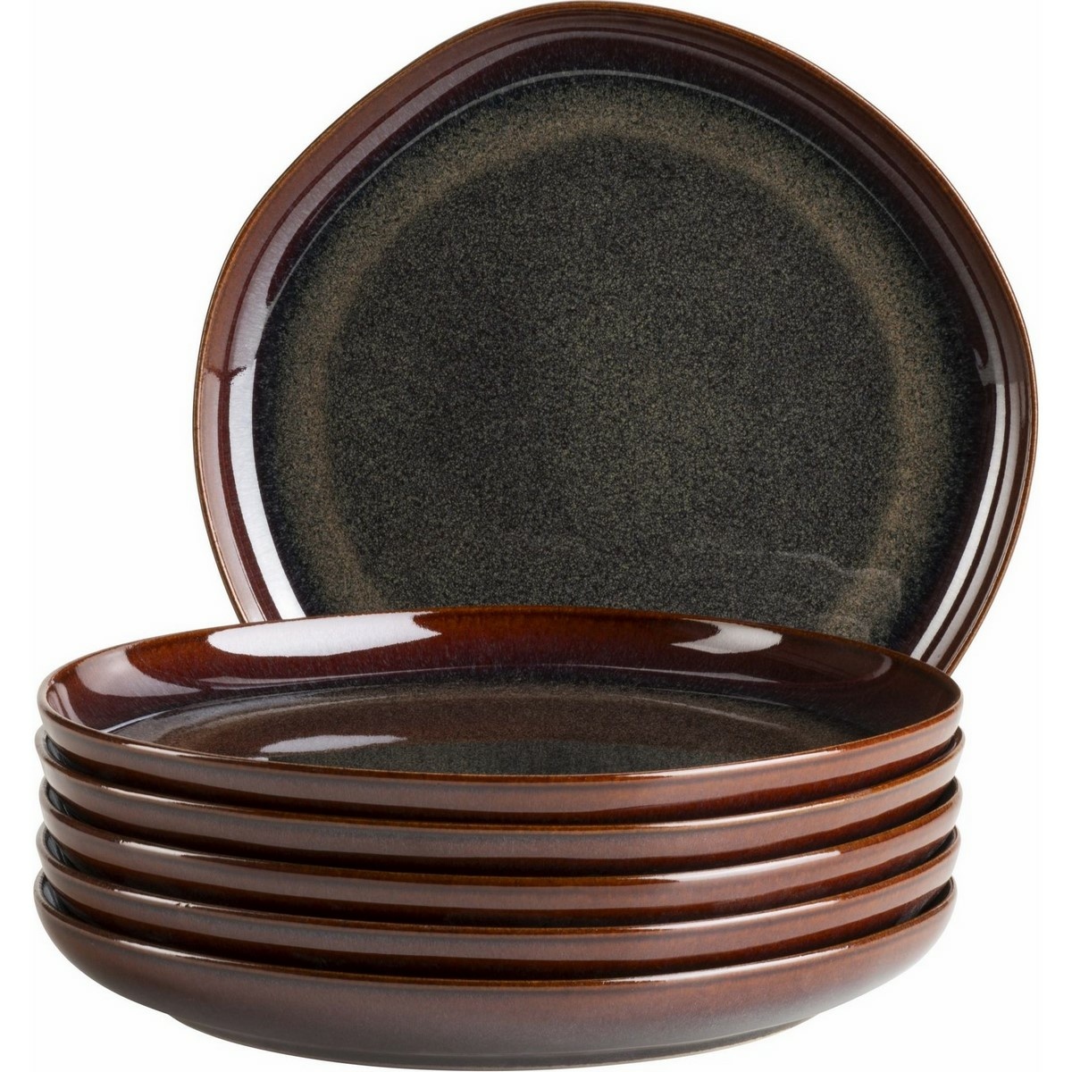 Vzhľad tejto súpravy vychádza z prírodných tónov a organických tvarov. Reaktívna glazúra v sýtej sivohnedej farbe so zelenými odtieňmi vytvára na každom kuse jedinečný vzor s drobnými bodkami a prechodmi, ktoré podčiarkujú prirodzený charakter kameniny. Lesklý povrch zvýrazňuje štruktúru glazúry a dodáva celku elegantný výraz. Mierne nepravidelný tvar s jemne zaoblenými okrajmi pôsobí dojmom ručnej práce a vnáša do prestretého stola osobitú atmosféru.