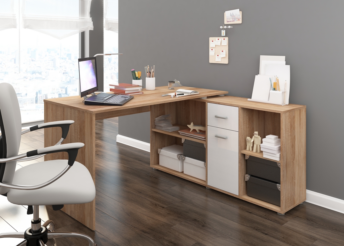 MEBLOCROSS Beat P rohový písací stôl sonoma svetlá / biely lesk