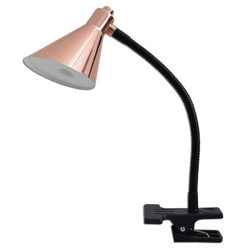 Svietidlo Janita LED s pekným a moderne tvarovaným tienidlom z kovu Toto svietidlo s LED diódami je exkluzívny zdroj svetla pre modernú atmosféru, ktorý upúta pozornosť najmä vďaka svojmu lesklému medenému povrchu. Čierny rám je krásnym farebným doplnkom. Integrované LED diódy môžu svietiť najmä vďaka vysokému svetelnému výkonu, pretože pri nízkej spotrebe energie vzniká vysoký svetelný tok. Praktická upínacia základňa umožňuje rýchle a pohodlné pripevnenie svietidla na okraj stola alebo police, kde je potom zaručené bezpečné uchytenie.