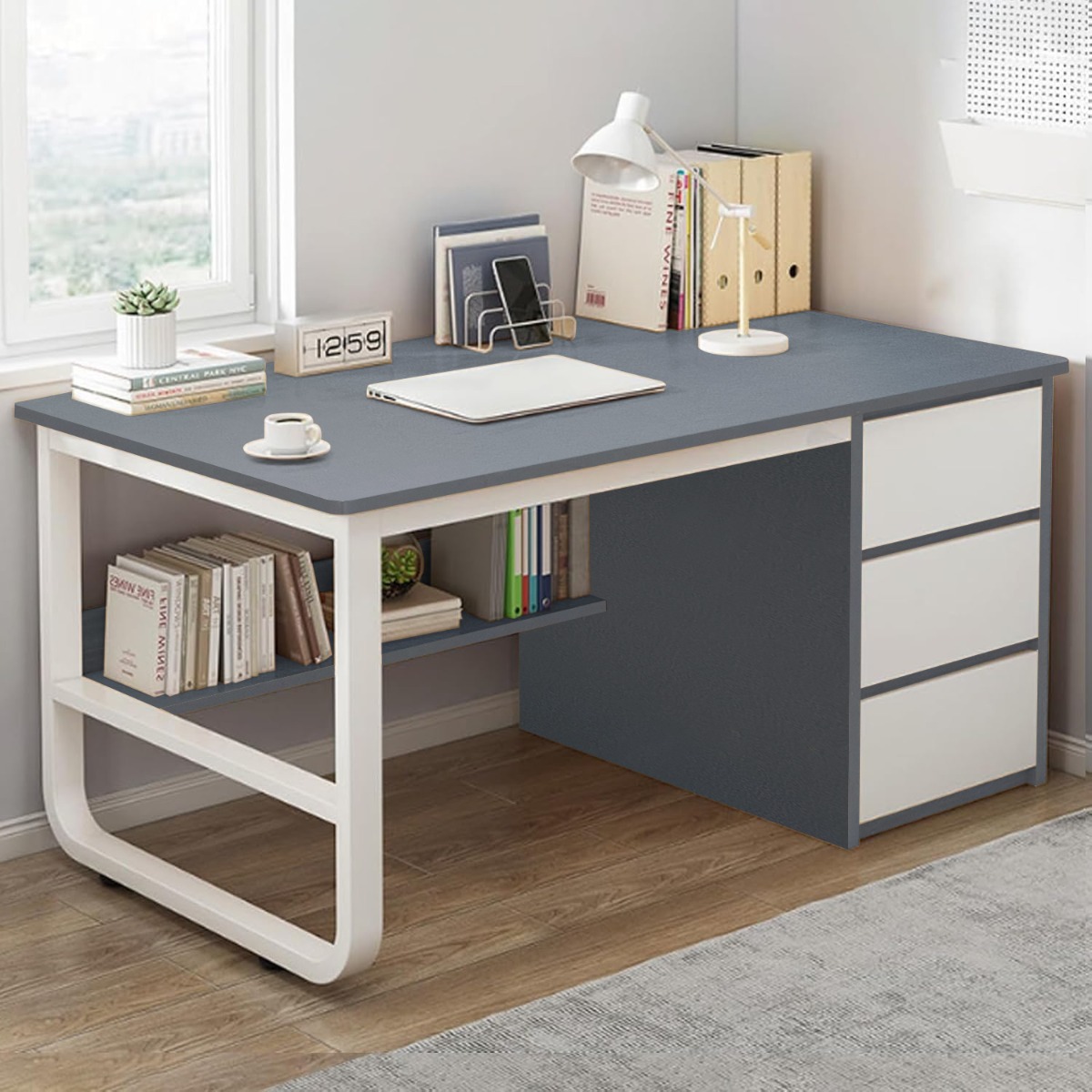 Moderný písací stôl MELANY 120 bude praktickým pomocníkom vo vašej pracovni či študentskej izbe. Vďaka univerzálnemu vzhľadu ho môžete umiestniť takmer kamkoľvek a svojím nenápadným dizajnom zapadne takmer do každého štýlu zariadenia.Vďaka širokej 120 cm pracovnej ploche z kvalitného MDF materiálu vo farebnom prevedení antracit, budete mať dostatok priestoru na pohodlnú prácu či štúdium. Kovový rám v bielej farbe je stabilný a pevný. Využijete tiež množstvo úložného priestoru v podobe 3 zásuviek a odkladacej police.Rozmery: (š/h/v) 120 x 50 x 74,5cmFarebné prevedenie: biela / antracitDodávame v demonte.Upozornenie: Výsuv zásuviek nezabezpečujú koľajničky, zásuvky sú voľne zasunuté (viď. obr.) s inštalovanou zarážkou proti vypadnutiu. Vnútro zásuviek je menšie ako formát A4.
