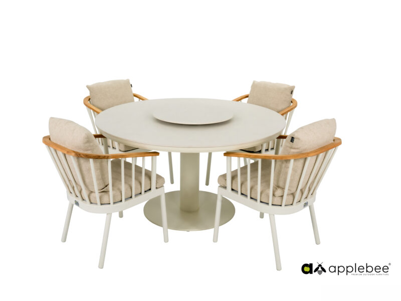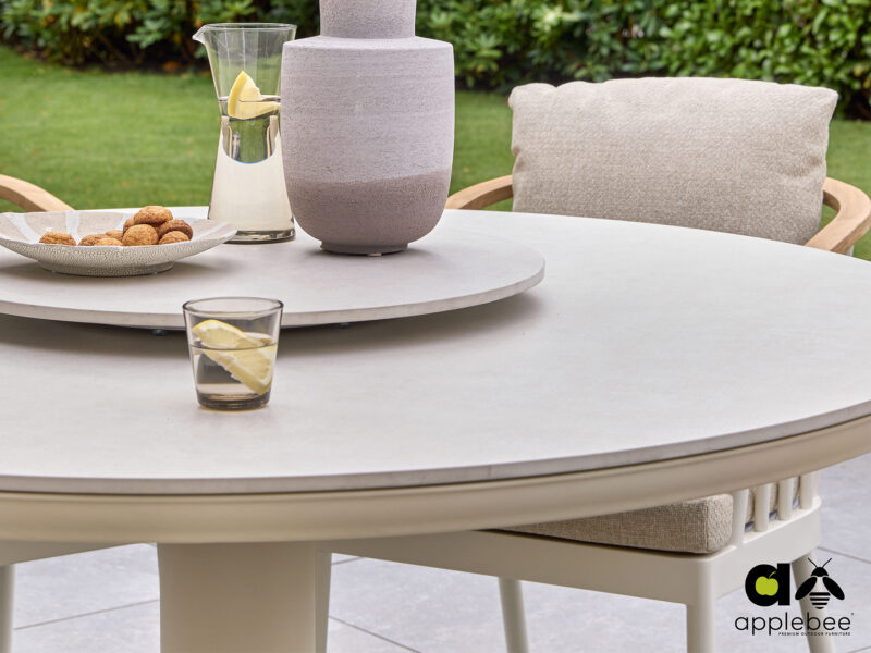 Melville jedálenský stôl v krémovom prevedení kombinuje odolnú Sinterstone dosku s hliníkovou konštrukciou. Vďaka svojim neutrálnym tónom a jemným líniam skvele zapasuje do akéhokoľvek exteriéru.