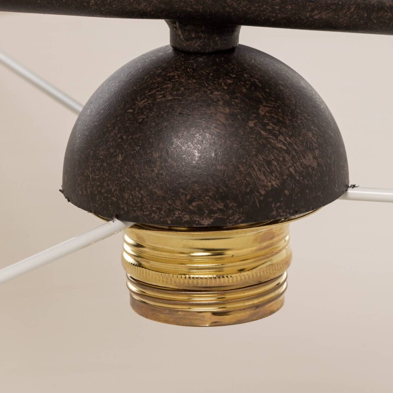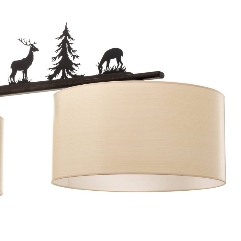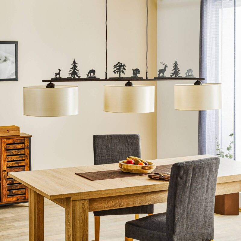 Troj-plameňová závesná lampa s trámom TH91303 v štýle vidieckeho domu Trám troj-plameňovej závesnej lampy TH91303 bol navrhnutý v rustikálnom tvare zo železa s povrchom hnedého antracitu. K nemu je magneticky pripojených osem vymeniteľných motívov z prírody, ktoré je možné vymeniť a usporiadať podľa vlastného vkusu. Okrúhle tienidlá na lampu boli zafarbené lakovacou technikou a spôsobujú priame osvetlenie zariadenia pod nimi, ako aj priame vyžarovanie svetla smerom nahor, zatiaľ čo tienidlá na lampu svetlo zjemňujú a prepúšťajú ho ako tlmené. Závesná lampa nájde svoje vhodné miesto použitia v bytoch v štýle vidieckeho domu nad stolom v obývačke alebo jedálni.