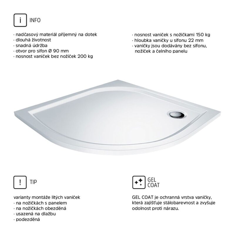 Sprchové kúty série Kora, vnášajú do ekonomickej triedy nový rozmer kvality. Hrúbka bezpečnostného skla je 4 mm, číre sklo. S profilmi v leštenom hliníku. Sprchovací kút je vybavený posuvnými dverami, ktoré majú ložiskové pojazdy s excentrickým osadením (vďaka tomu máte možnosť perfektného nastavenia). Dorazy zaisťujú minimálny náraz pri otváraní a zatváraní sprchovacieho kúta.Spodné pojazdy umožňujú odklopenie posuvných časti sprchovacieho kúta a vyčistenie bežne nedostupných miest. Tesnosť medzi pevnou a posuvnou časťou je zaistená silikónovými lištami. Nejedná sa však o hermeticky uzavretý výrobok.Sprchové vaničky z liateho mramoru sú opatrené ochrannou vrstvou Gelcoat, ktorá zaisťuje stálofarebnosť a odolnosť proti nárazu.Tieto sprchové vaničky, predstavujú nadčasové a elegantné riešenie.- ľahká údržba- vysoká odolnosť- nadčasový materiál- otvor pre sifón ø 90 mm ;- vr. sifónuVarianta montáže liatych vaničiek:- na nožičkách s panelom- na nožičkách obmurovaná- pokládka na podlahu- podmurovaná Ean: 8596462056447