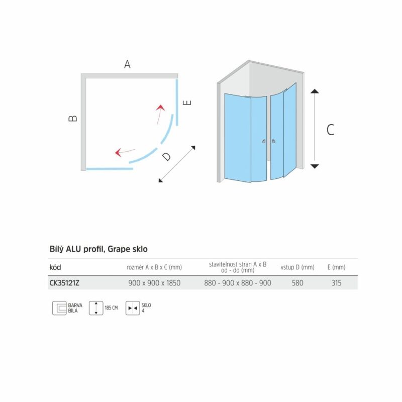 Hrúbka bezpečnostného skla je 4 mm, v dizajnu Grape. Sprchový kút je osadený posuvnými dverami, ktoré majú ložiskové pojazdy s excentrickým usadením (možnosť perfektného nastavenia). Dorazy zaisťujú minimálnue nárazy pri otváraní a zatváraní sprchovacieho kúta.Spodné pojazdy umožňujú odklopenie posuvnej části sprchovacieho kúta a vyčistenie bežne nedostupných miest. Tesnosť medzi pevnou a posuvnou časťou je zaistená stieracími silikónovými lištami na obi dvoch častiach. Ean: 8592480080785