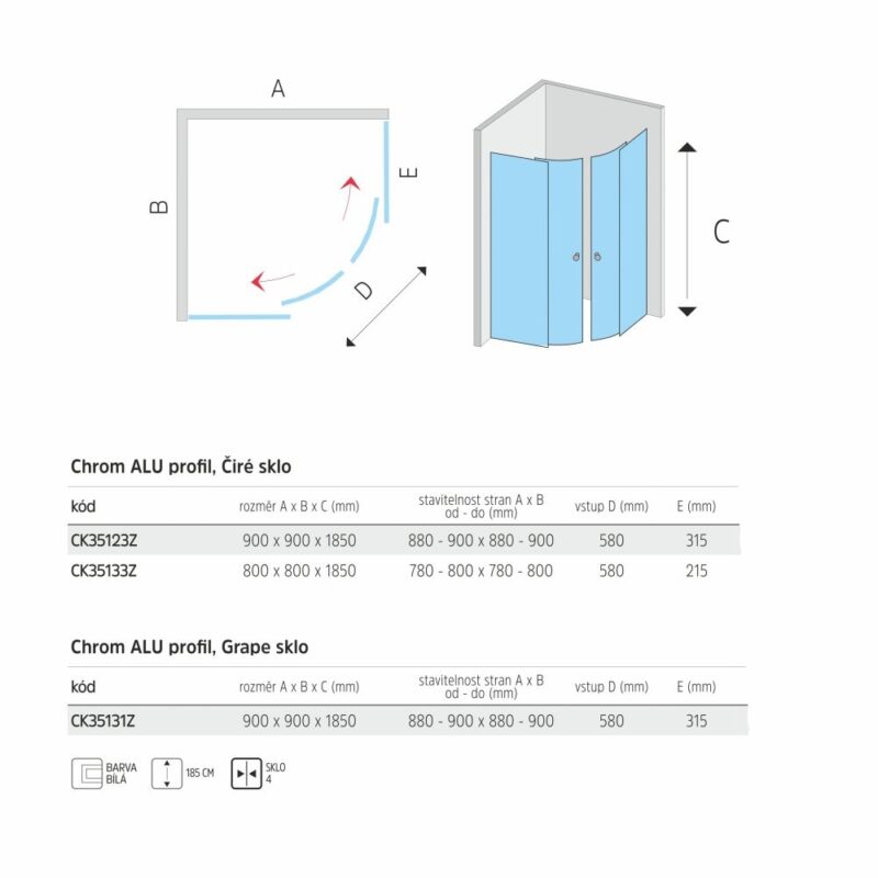 Hrúbka bezpečnostného skla je 4 mm, v dizajnu Grape. Sprchový kút je osadený posuvnými dverami, ktoré majú ložiskové pojazdy s excentrickým usadením (možnosť perfektného nastavenia). Dorazy zaisťujú minimálnue nárazy pri otváraní a zatváraní sprchovacieho kúta.Spodné pojazdy umožňujú odklopenie posuvnej části sprchovacieho kúta a vyčistenie bežne nedostupných miest. Tesnosť medzi pevnou a posuvnou časťou je zaistená stieracími silikónovými lištami na obi dvoch častiach.V ceně kúta nie je zahrnutá cena vaničky. Ean: 8596462056249